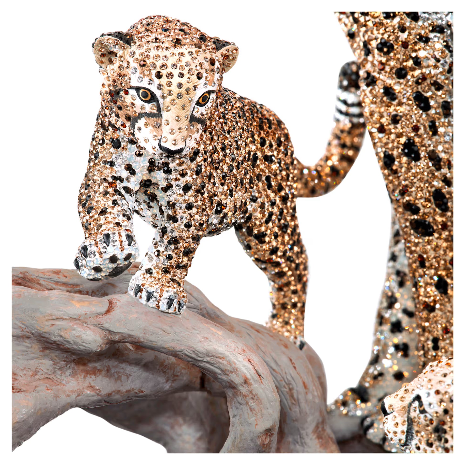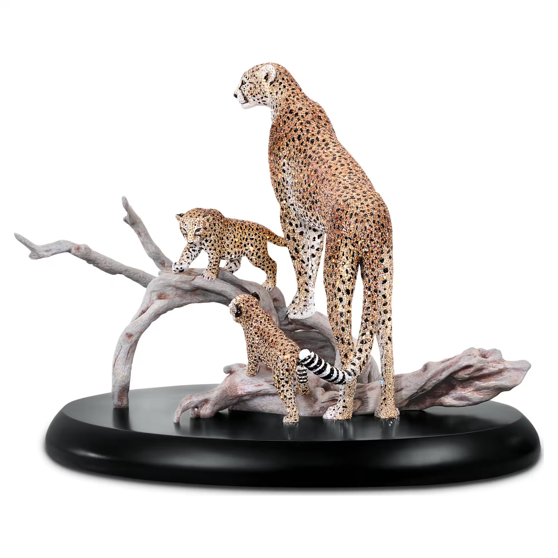 A majestic family of cheetahs takes center stage in this powerful and thought-provoking sculpture, which takes 324 hours to complete. Fashioned with more than 53,000 crystals, it is an exquisite example of our Pointiage® technique, displaying the skill and precision of our master craftspeople. The animals feature their typical tear-shaped stripes from eyes to mouth and spotted fur that is exceptionally detailed. The name Mirembe means “peace and quiet”, a perfect representation of this tranquil scene with a mother cheetah and her two young cubs. This creation will enhance any home as a testament to the uniqueness and beauty of these animals, as well as the importance of protecting their delicate habitat. This piece is only available in a limited worldwide number of 200. Decoration object. Not a toy. Not suitable for children under 15.