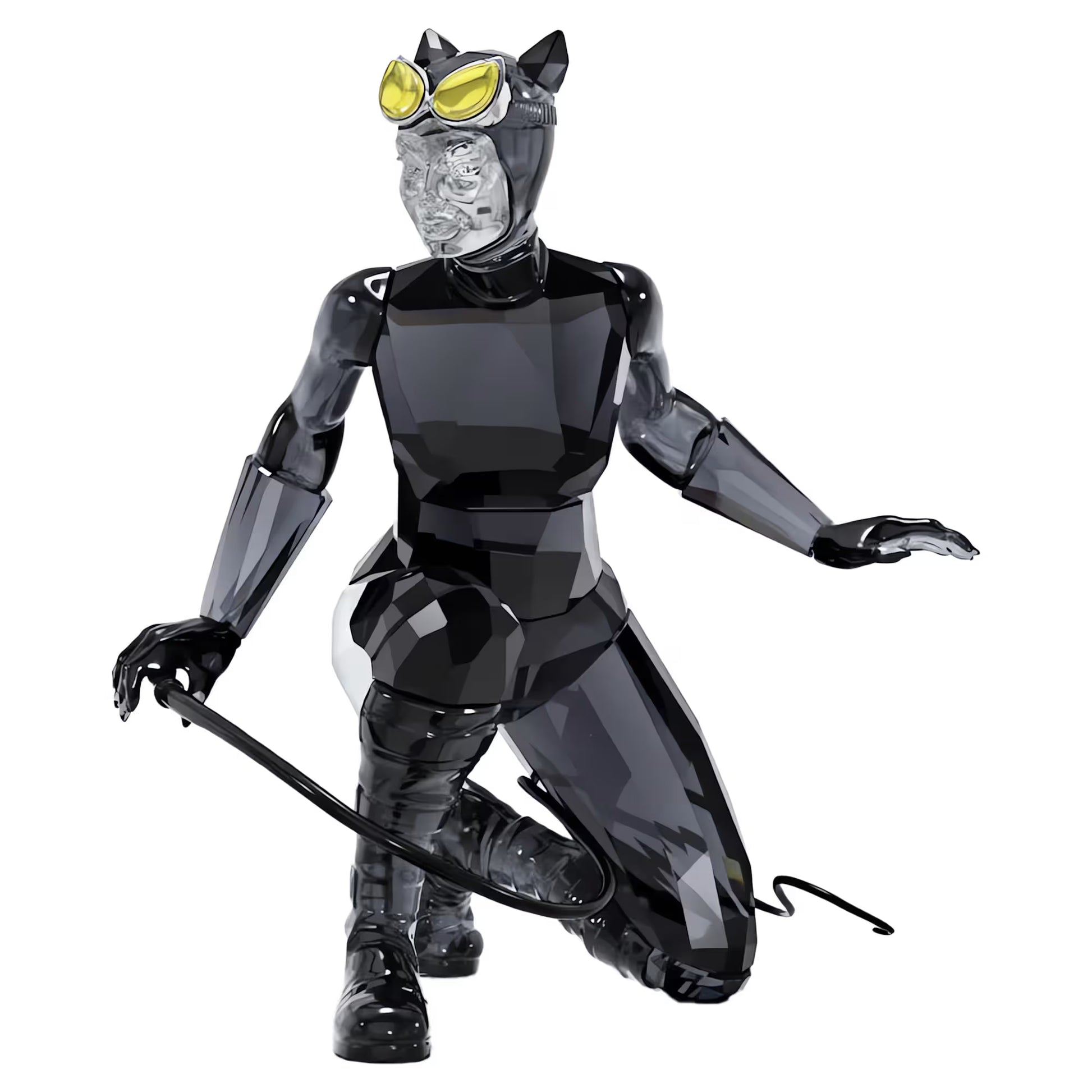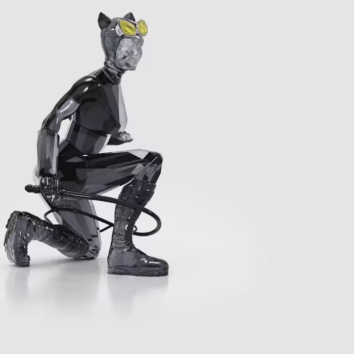 Joining our popular DC collection, this iconic design depicts the beautiful but deadly Catwoman. Crouched and ready to pounce, she wears a skintight catsuit with a mask, cat-eye goggles, gloves, chunky boots, and a whip. The design shines brilliantly with 517 facets of clear, black, and yellow crystal, with lacquered and nickel-coated metal accents. Batman fans and collectors will love this detailed and authentic statement piece. Decoration object. Not a toy. Not suitable for children under 15.