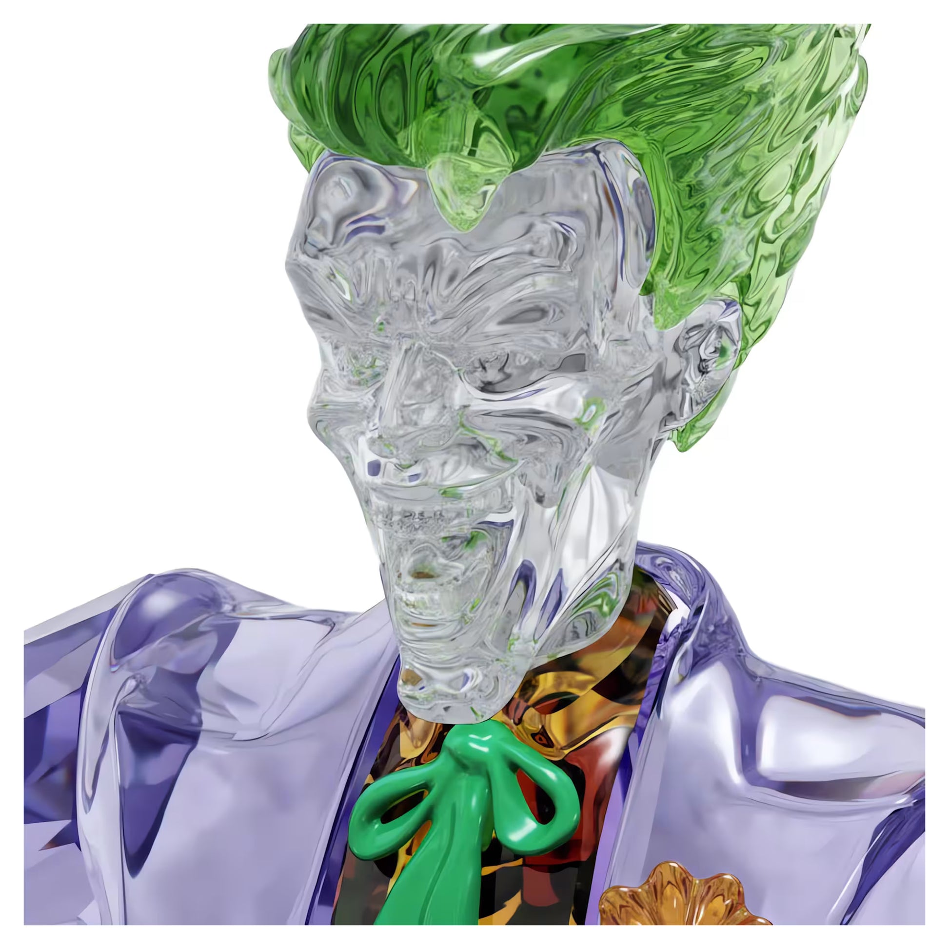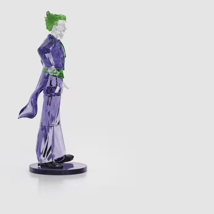 Gotham City meets Swarovski shine in this detailed interpretation of Batman's nemesis, the Joker. With his green hair and crazed grin, the one and only Clown Prince of Crime wears his signature purple suit, paired with a green waistcoat, tie, and orange shirt. A lacquered metal cane with gold-tone plated metal detailing completes his iconic look. Expertly crafted with 622 crystal facets, this collector's piece is a real treat for Batman and DC fans. Decoration object. Not a toy. Not suitable for children under 15.