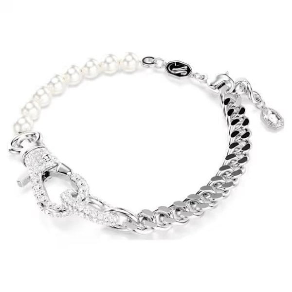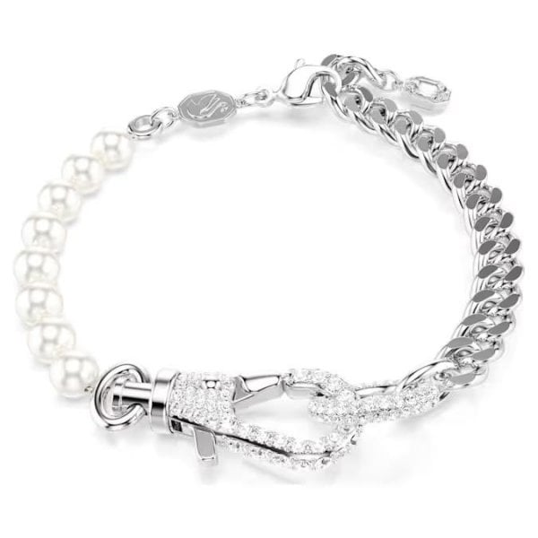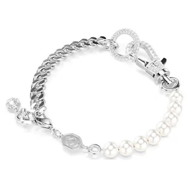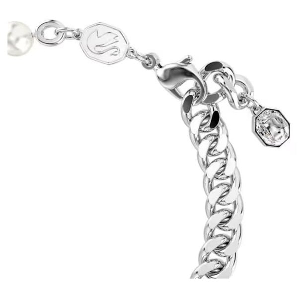 This impactful Dextera bracelet features an array of details to admire. The rhodium plated design combines a solid chain with a string of small white Swarovski Crystal Pearls, joined in the centre with a distinctive lobster closure adorned with pavé clear crystals. A powerful choice for bold looks.