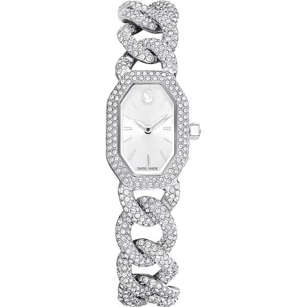 Highlighting Swarovskis iconic octagon shape and set with 623 crystals, this dazzling watch wears like a piece of fine jewellery. The stainless steel case measures 44mm in length and features a shimmering pavé on the bezel alongside a sunray dial with an elegant swan logo at 12 oclock. The watch is worn around the wrist on an adjustable gourmette chain embellished with 530 crystals, while a single crystal is also set within the crown. This Swiss made watch is water resistant to 30 meters and is a spectacular choice for everyday glamour and special occasion opulence.