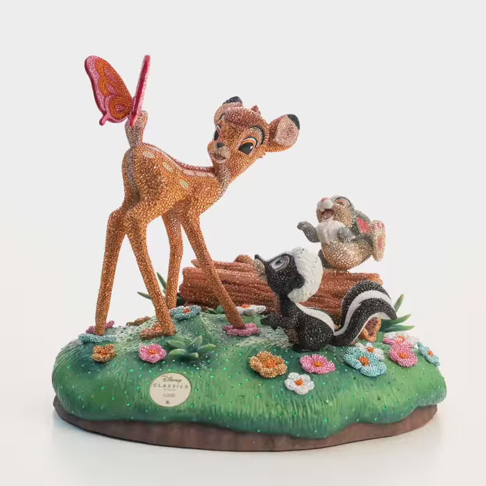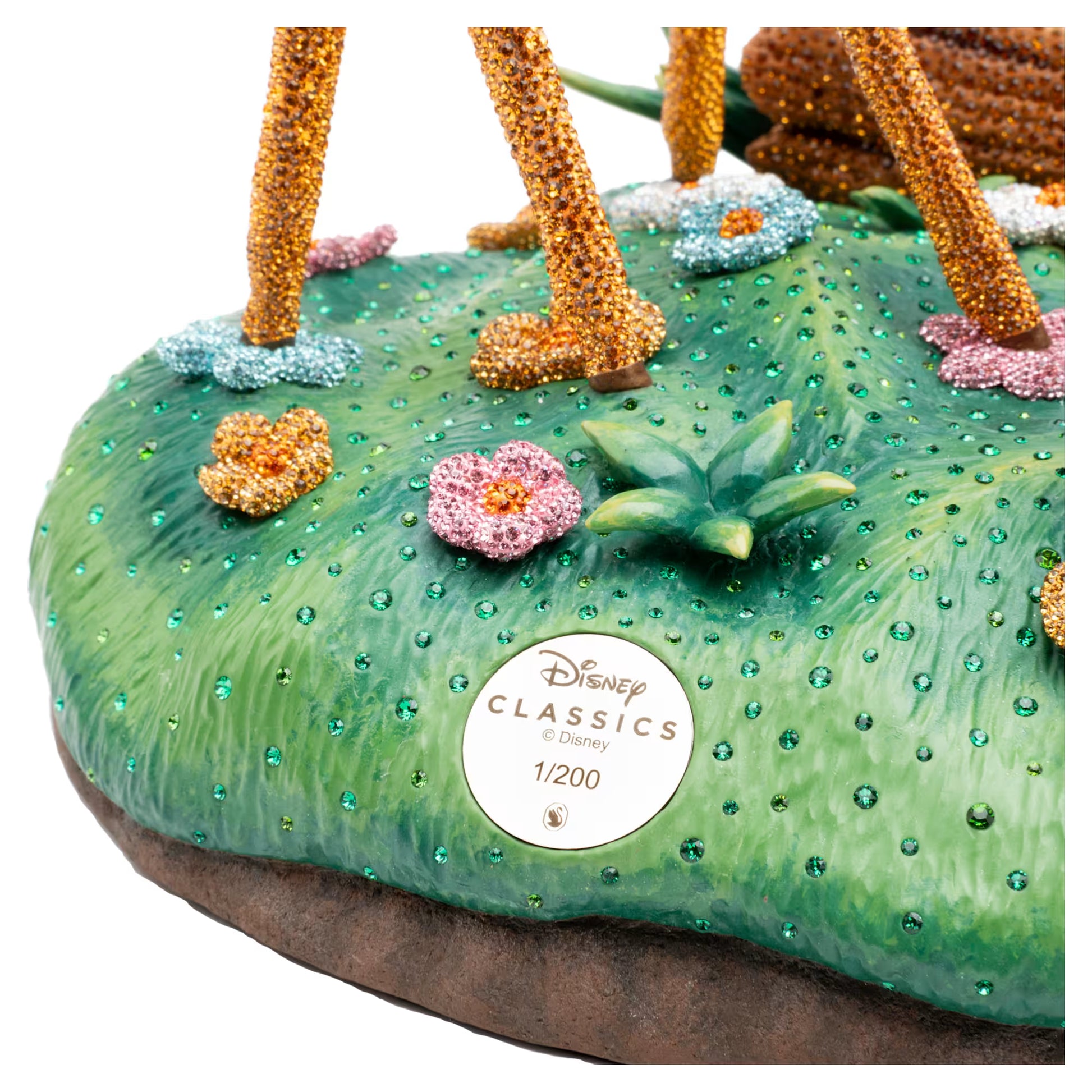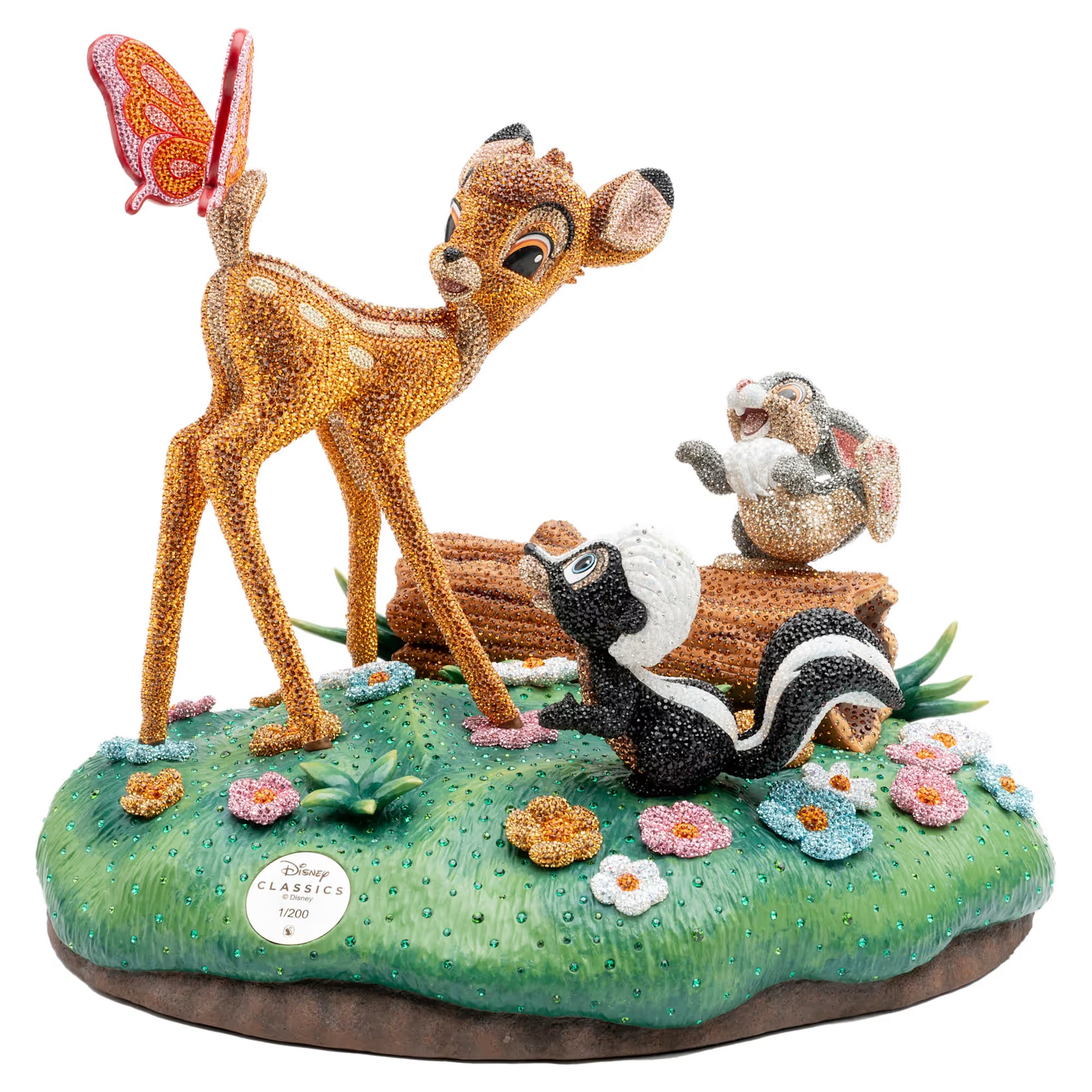 Immerse yourself in this enchanting Disney scene, where the young fawn, inspired by Bambi, spends an idyllic summer’s day with his forest friends. Over 43,000 hand-set crystals were used to create a vision of nature, where Disney’s characters Bambi, the playful rabbit Thumper and the shy, gentle skunk, Flower, play together. Take note of the bright butterfly, the hand-painted eyes of each character and the radiant wildflowers, which bring the moment to life. Taking around 350 hours to complete, the figurine is set on a base with a silver-tone plaque, which is engraved with the limited edition number. Only 200 Limited Edition pieces are available, making it a rare and perfect gift for any Disney fan who still retains their childlike spirit. Decoration object. Not a toy. Not suitable for children under 15.