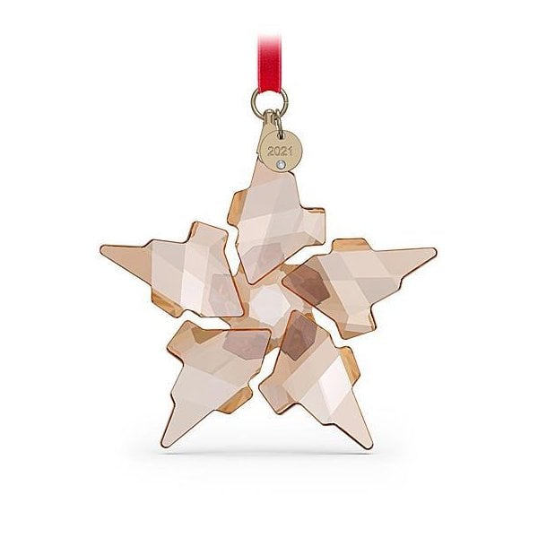 The tradition of a Swarovski Annual Edition Ornament continues into its 30th year with this festive crystal creation by Michele Blasilli. The ornament has undergone a remarkable transformation to celebrate its special anniversary, adding contemporary appeal to its timeless design. The star has been expertly cut in an innovative, new asymmetric style to sparkle with 67 gold-tone crystal facets. The red velvet ribbon and brushed champagne gold-tone metal accents are fresh and modern. Exclusively available in 2021, its metal tag in a round shape is engraved with the year and embellished with a small crystal. Perfect for hanging on a decorative tree or in a window. Decoration object. Not a toy. Not suitable for children under 15.