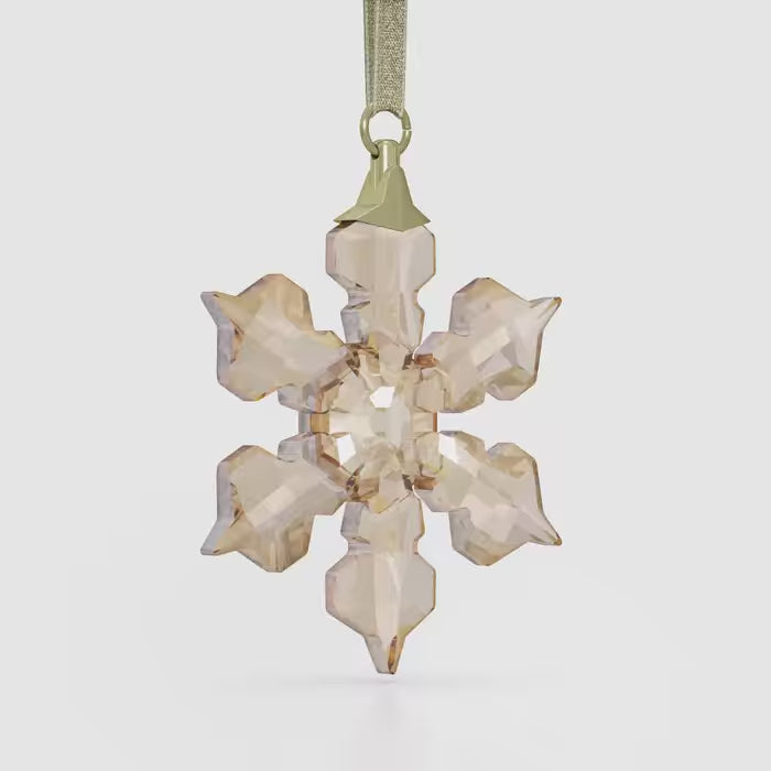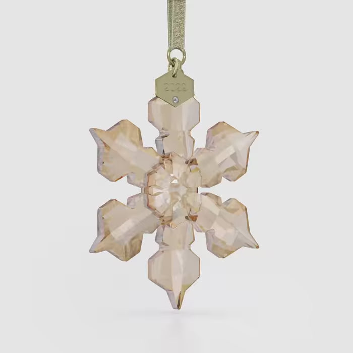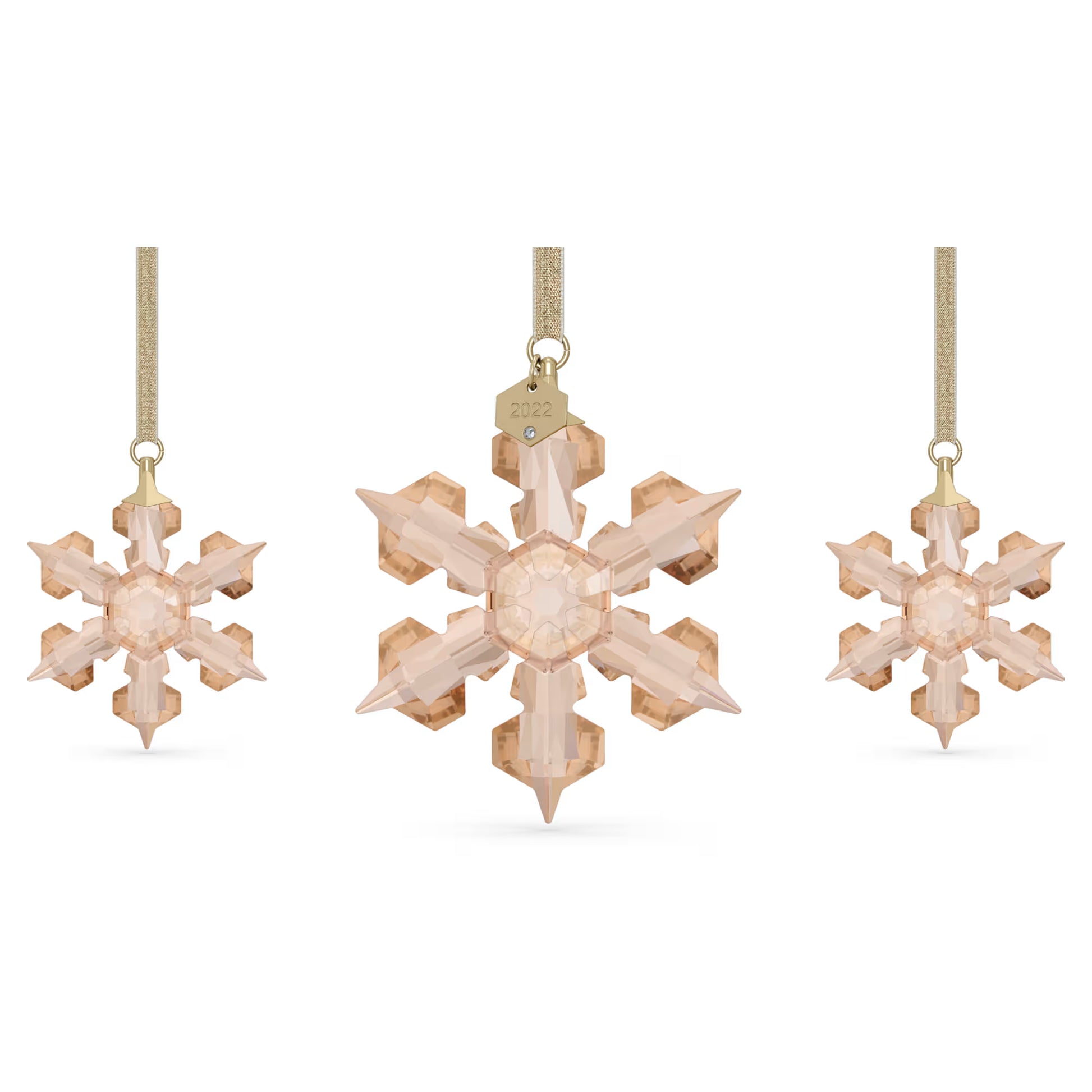 Swarovski's tradition of Annual Edition ornaments continues into its fourth decade with this set containing three stunning creations in gold-toned crystal. The larger snowflake design has been expertly cut to shine with 170 crystal facets and hangs from a golden lamé ribbon. Exclusively available in 2022, it is topped with an elegantly engraved, crystal-studded tag reading '2022', making it a perfect gift to commemorate any special occasion. It is joined in the set by two smaller versions of the same design, without the engraved tag, which are also exclusive to 2022. Perfect for hanging on a decorative tree or in a window, this trio of ornaments will be treasured for a lifetime. Decoration object. Not a toy. Not suitable for children under 15.