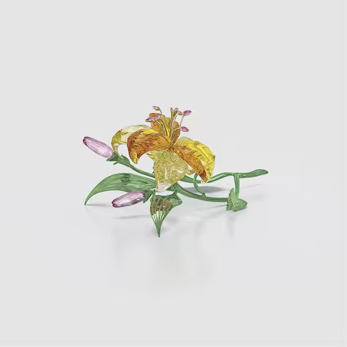 The lily is an enduring symbol of purity and innocence. In this life-size tribute, Swarovski has beautifully captured these qualities in a dazzling creation that features 633 facets. Each detail of the flower has been perfectly formed, revealing bright touches of yellow and pink, alongside elegant stems and leaves made from green lacquered metal. This horizontal display is freestanding and would make a truly impressive tablescaping piece in your home. No vase or base required. Decoration object. Not a toy. Not suitable for children under 15.