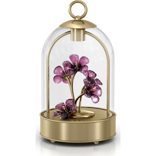 Light up any home décor, from modern to classic, with this elegant LED lantern. Crafted in brushed champagne-gold tone metal and glass, it showcases five stunning hibiscus flowers, shining with 1,900 facets of purple and light yellow crystal. With the in-built LED functionality, chargeable via USB, acting as a spotlight with dazzling effect, the hibiscus flowers, which are thought to symbolize youth, success, femininity, and wisdom, take center stage. Decoration object. Not a toy. Not suitable for children under 15. USB charging cable included. When the battery is fully charged, the lantern can be operated at full intensity for 24 hours.