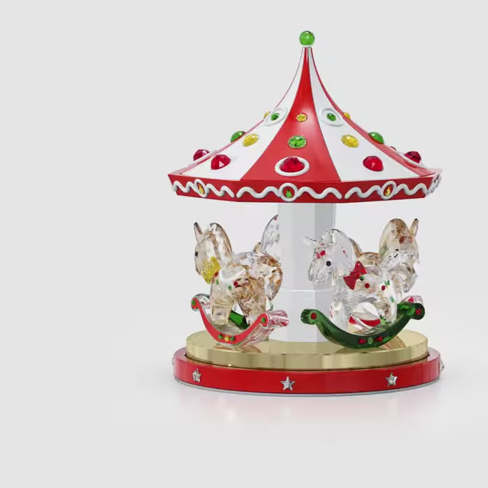 Inject holiday cheer into your décor with this rotational carousel that shines from every angle as it is manually spun. Awakening memories of festive markets filled with joyful music and twinkling lights, it is beautifully crafted with over 2,200 multi-coloured crystal facets and four full-cut crystal rocking horses. The warm gold-tone metal platform and small crystals that adorn the red and white roof add extra merry flourishes. An incredible centrepiece and great for gifting. Decoration object. Not a toy. Not suitable for children under 15.
