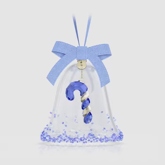 Ring in the start of the holiday season with this joyous bell ornament. The traditional motif has been skilfully crafted in glass with approximately 1,301 small crystal rocks covering the outside as if the piece has been dipped in sugar. A candy cane clapper in Swarovskis signature blue with luxurious gold-tone metal stripes is suspended in the centre. The bell hangs from a blue grosgrain ribbon tied in a bow and includes a champagne gold-tone metal tag with the year 2024 and a single chaton. Crafted with 253 radiant facets, this holiday ornament would be a beautiful addition to any festive décor. Decoration object. Not a toy. Not suitable for children under 15.