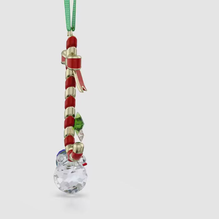 A crystallised sweet treat, this candy cane ornament is playful and charming. The design features a radiant candy cane with a suspended snowman and is crafted with 266 facets in festive shades. Hanging from a green grosgrain ribbon, the design is completed with glossy metallic accents. Gift to a loved one or place under your tree to raise a smile. Decoration object. Not a toy. Not suitable for children under 15.