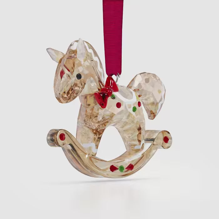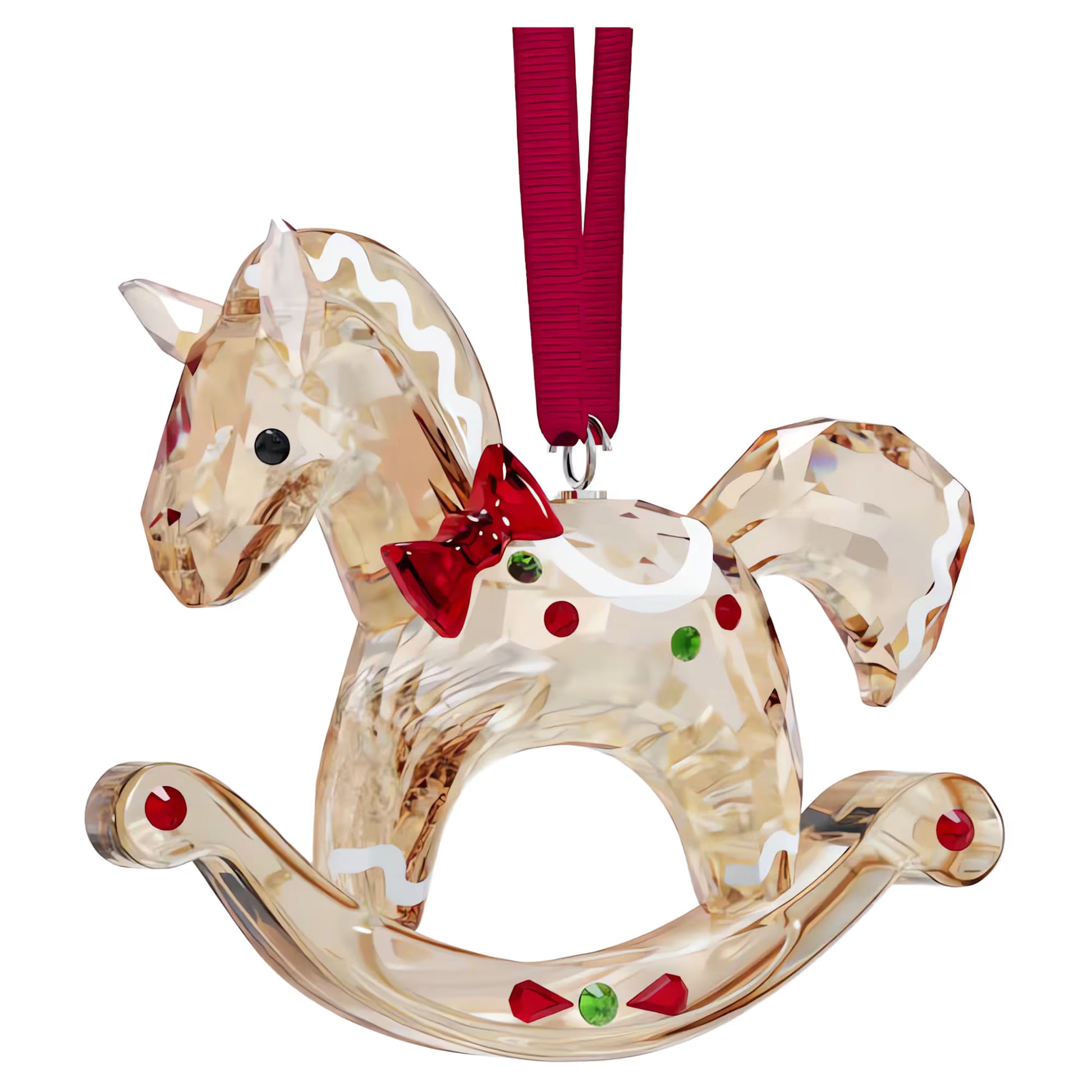 Evoke memories of holidays past with this festive rocking horse ornament. Designed to look like a gingerbread cookie, it shines with 325 facets of gold-toned crystal with white print detailing and red and green crystal accents. Hanging on a red grosgrain rayon ribbon, it will make a cute and charming gift or addition to your tree, especially when combined with the other pieces in the nostalgic Holiday Cheers collection. Decoration object. Not a toy. Not suitable for children under 15.