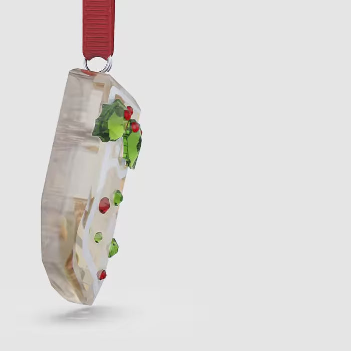 Awaiting the arrival of Santa, this cookie-cut gingerbread ornament encapsulates the magic of the holidays. Shaped like a stocking, the piece has a golden glow with 170 light-catching facets. Additional flatbacks, holly leaves and printed frosting elevate the designs refinement and radiance while evoking tradition. Ideal as a gift, this piece is suspended from a red grosgrain ribbon to hang on your tree or as part of a window display. Decoration object. Not a toy. Not suitable for children under 15.