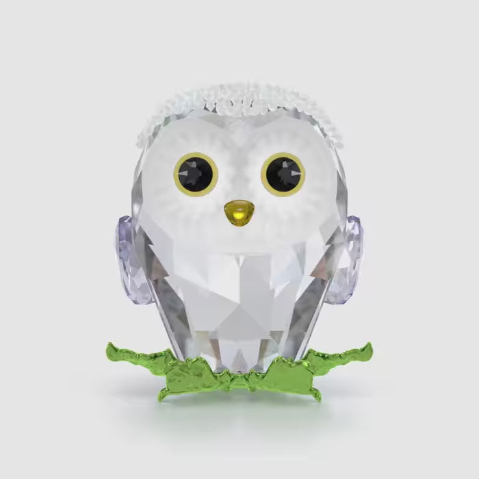 With its bright wide eyes and snow-covered head, this baby owl is irresistibly charming. Inspired by the Idyllia family, the ornament is crafted from 226 facets and approximately 420 crystal rocks. The owl sits atop a branch that is formed from metal with a green surface finish. An enchanting piece that is sure to bring joy to your home décor. Decoration object. Not a toy. Not suitable for children under 15.