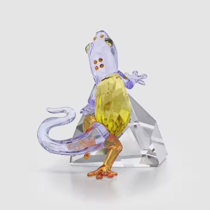 Emerging from the shade and climbing onto a rock to bask in the sun, this inquisitive gecko reveals his glorious colours to the world. The design is crafted with 437 facets and 6 individual crystals, and showcases a variety of warm tones including yellow, orange and lavender. Place it anywhere in your home as a centrepiece of joy. Decoration object. Not a toy. Not suitable for children under 15.