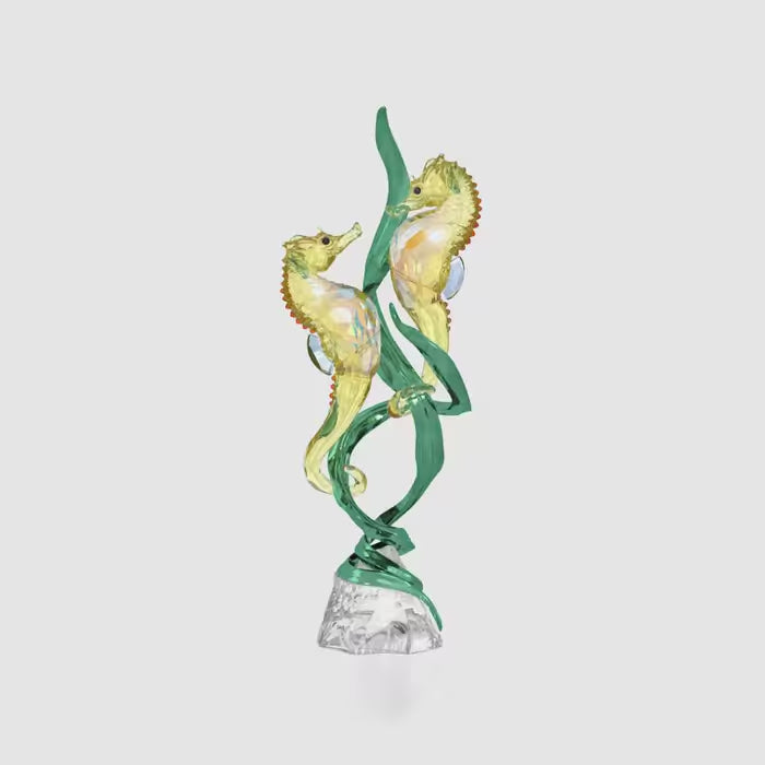Transport yourself to the depths of a magical and enchanting ocean with this year’s SCS Annual Edition. The sea-inspired scene has been created with 909 precision-cut facets and showcases two bright yellow seahorses, with blue fins and a radiant Shimmer effect, swimming amidst gently swaying seagrass made from glossy green metal. Presented in exclusive SCS packaging, the creativity is completed with elegant engravings on the crystal base, including the product name, designer initials and the year. Decoration object. Not a toy. Not suitable for children under 15.