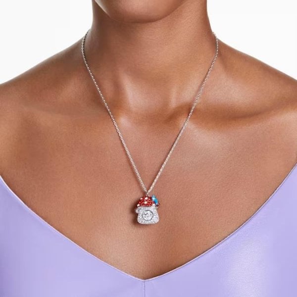 This enchanting mushroom pendant will take your style into a world of limitless imagination. Worn on a 65cm long chain, the rhodium-plated motif is created with an array of red and clear crystals, with a dancing Swarovski Zirconia at the centre, which catches the light. Spot the blue caterpillar on the side who adds an extra flourish, as well as the single Swarovski Zirconia that is placed in the chain’s elongation. A perfect gift for yourself or any fan of Alice in Wonderland.