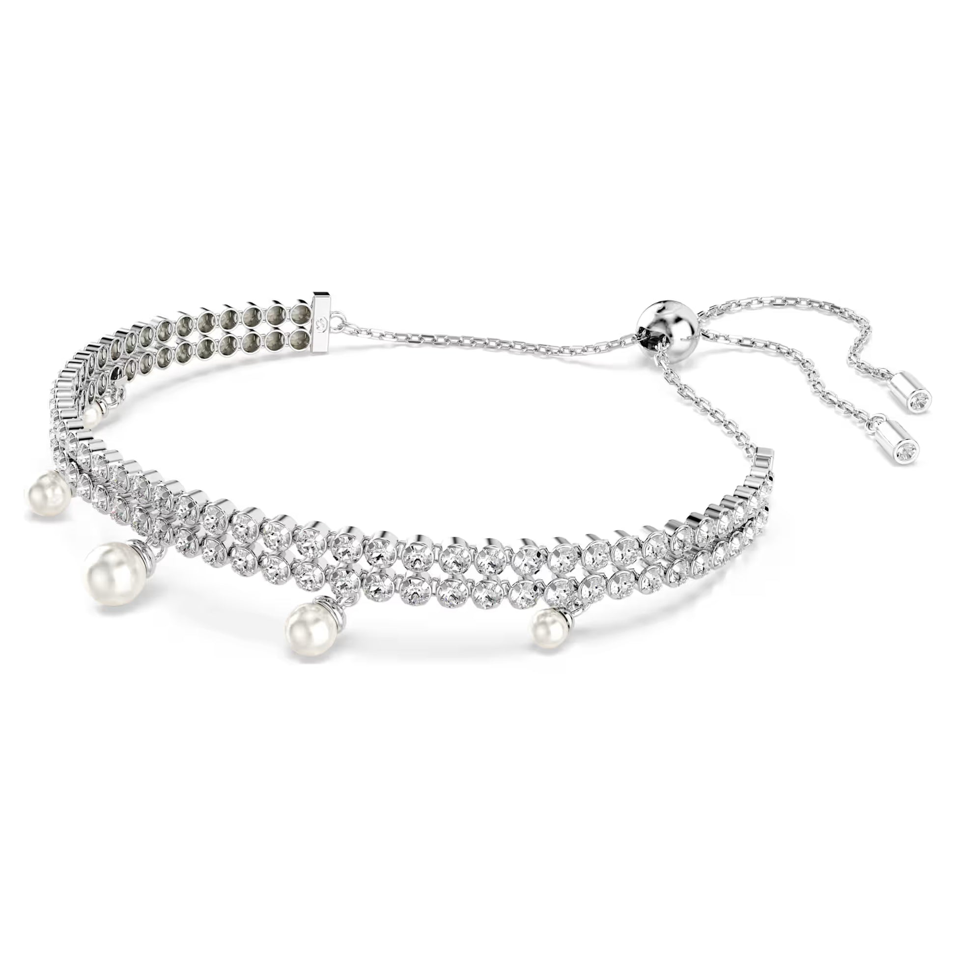 Discover a pure expression of elegance in this refined bracelet. Easily adjustable with a sliding ball closure, the rhodium plated design features two rows of cupchain, set with clear Geometric Swarovski Zirconia in round cuts. An adornment of Swarovski Crystal Pearls is then added below for a sensational look of luxury. Pair this bracelet with the matching choker to create your own expressive combination.