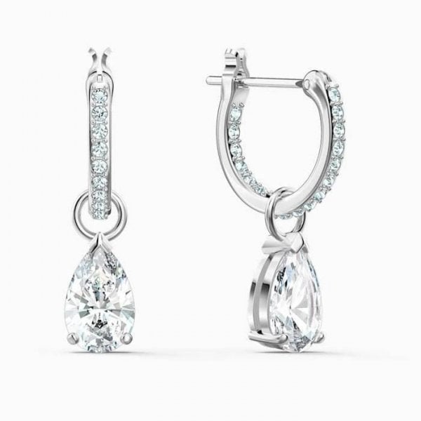 This pair of pierced earrings by Swarovski offers beautiful versatility. Two parts make up each earring: A hoop adorned with sparkling pavé and a single, drop-shaped stone attached to them. Simply remove the dangling elements to create different looks. A