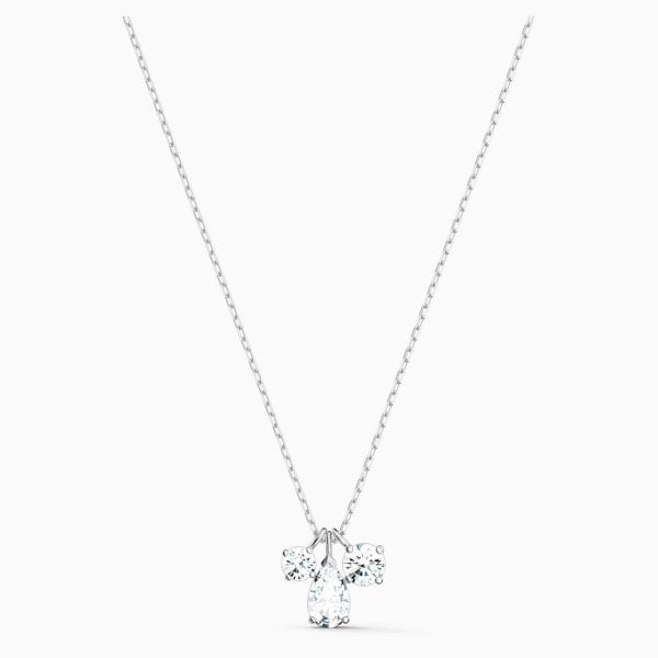 This pendant by Swarovski displays artful craftsmanship. It is adorned with three shimmering white stones: The central, drop-shaped element is complemented beautifully by two smaller, round stones. Delicate facets create a refined yet simple look, perfect for embellishing everyday outfits. The pendant is complemented by a matching chain and pairs perfectly with similar pieces of jewellery.