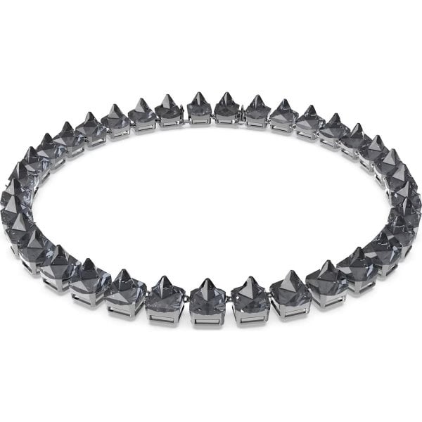 Three-dimensional, pyramid-cut crystals in an elegant shade of grey form this genderless, all-around necklace. Set on a metal-plated frame and complete with a hidden fastening, this piece draws inspiration from the work of artist Emma Kunz. Wear yours alone or layered with other jewellery from the Chroma family to make a geometric statement. This necklace is part of the Chroma family, designed by Creative Director Giovanna Engelbert for Collection III. How to close and open it: place the rounded baton into the widest point of the opposite hole and slide it down to the lowest point. Once in place, lower the D-ring security catch on top to secure the fastening. To open, lift up the D-ring security catch and slide the baton towards the widest point to release.
