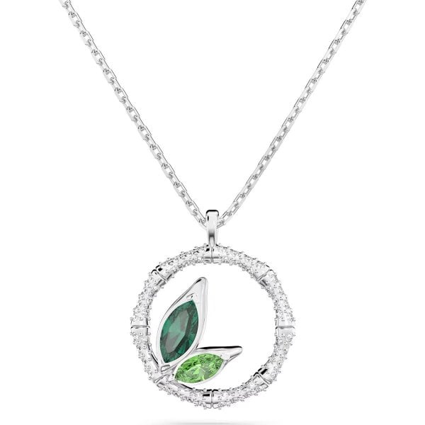 Shine bright in this exquisite necklace from the Dellium family. Inspired by the inner strength of bamboo, it features pavé-embellished links that reflect the lucky number eight. Two green crystals inside a circular pendant finished with rhodium plating complete this delicate piece. It will make a meaningful gift for a loved one, or yourself.