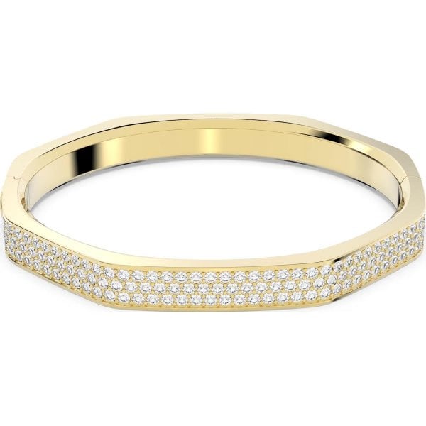 The Swarovski Dextera Gold Plated Octagon Bangle is delicately crafted from base metal with yellow gold plating. Structured with an octagonal design, the gold-plated bangle features round white Swarovski pave crystals that shimmer in the light. The bangle has a hinged opening for a secure fitting.