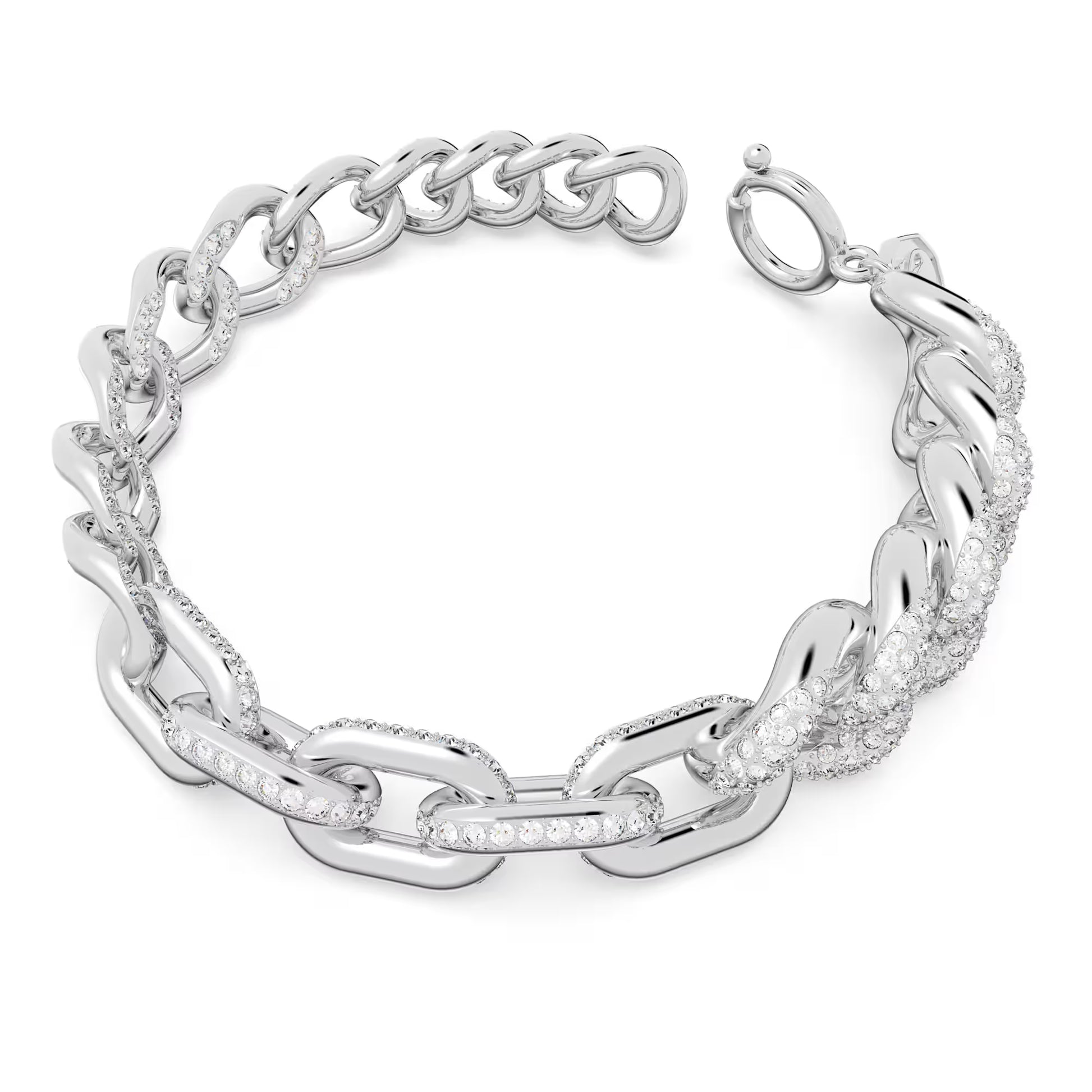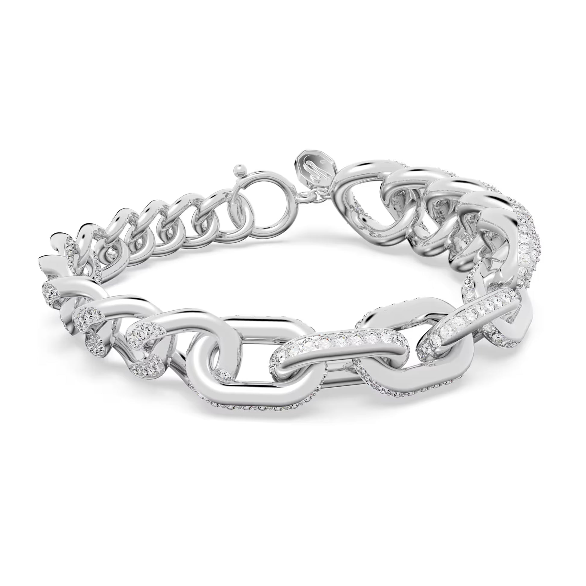 Designed to be genderless, this statement bracelet will elevate any look. Striking the perfect harmony of Swarovski's iconic pavé technique with bold metal construction, this rhodium-plated piece puts a contemporary spin on classic chain link designs. It has a refined spring closure and can be styled with anything, from office tailoring to formal eveningwear. This bracelet is part of the Dextera family, designed by Creative Director Giovanna Engelbert for Collection III.