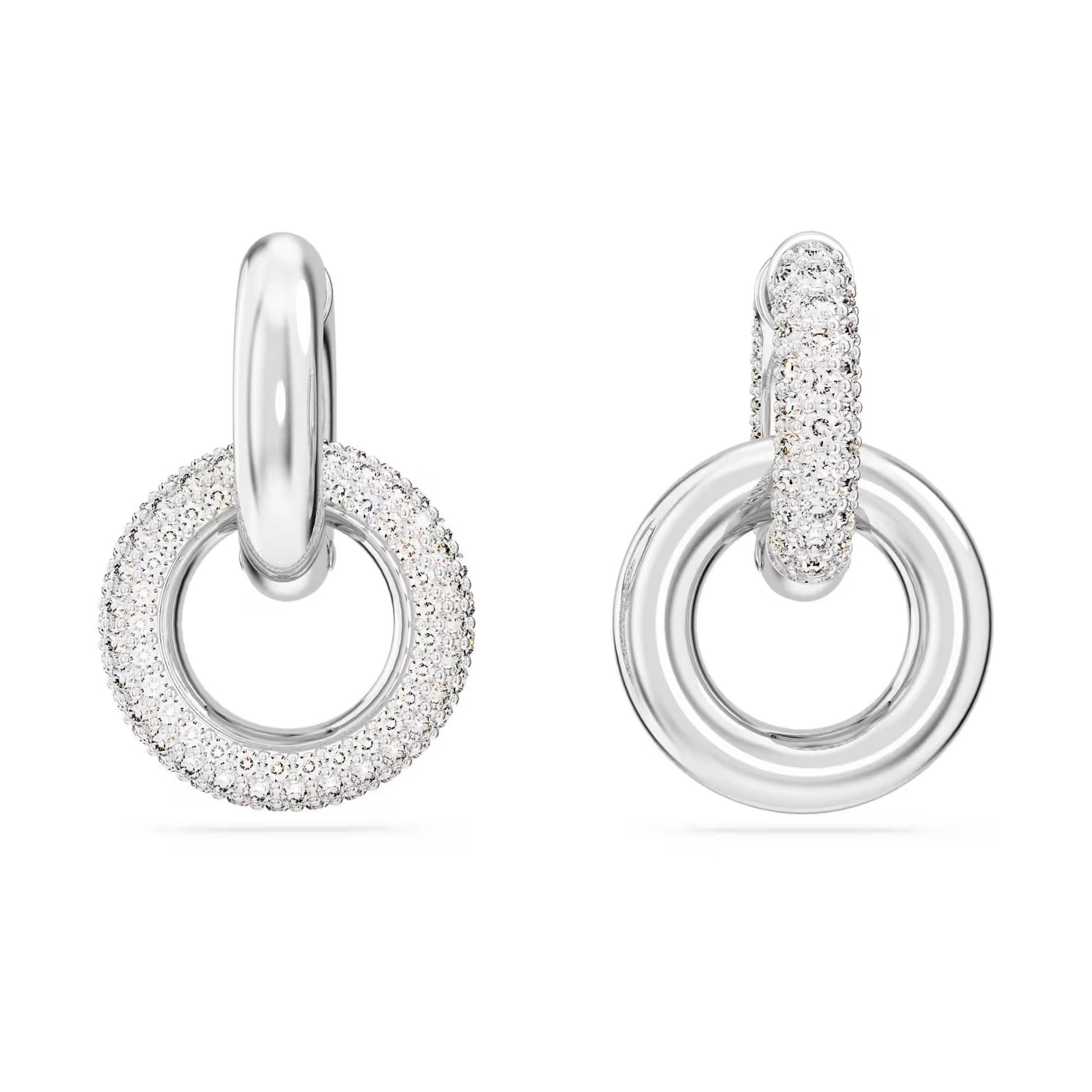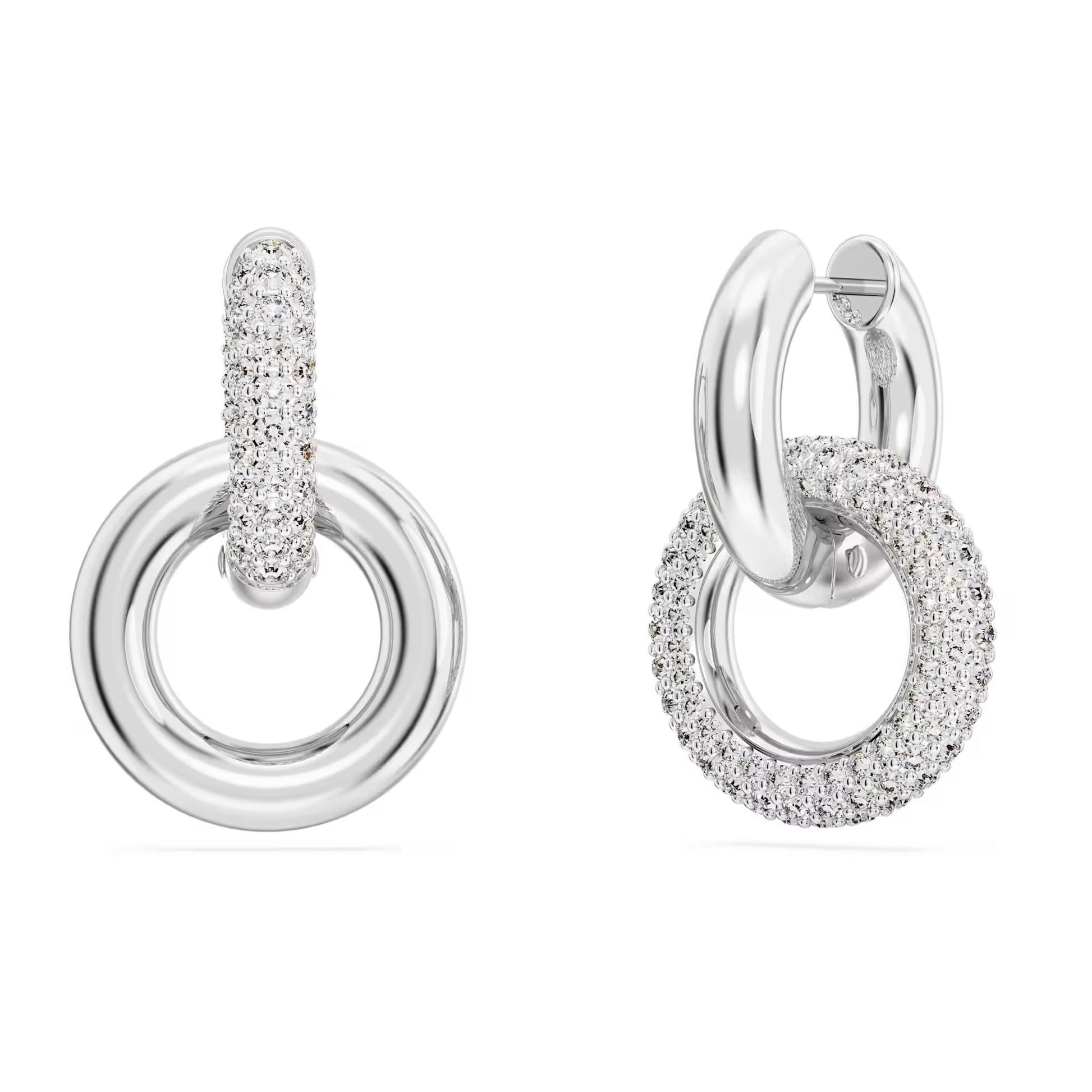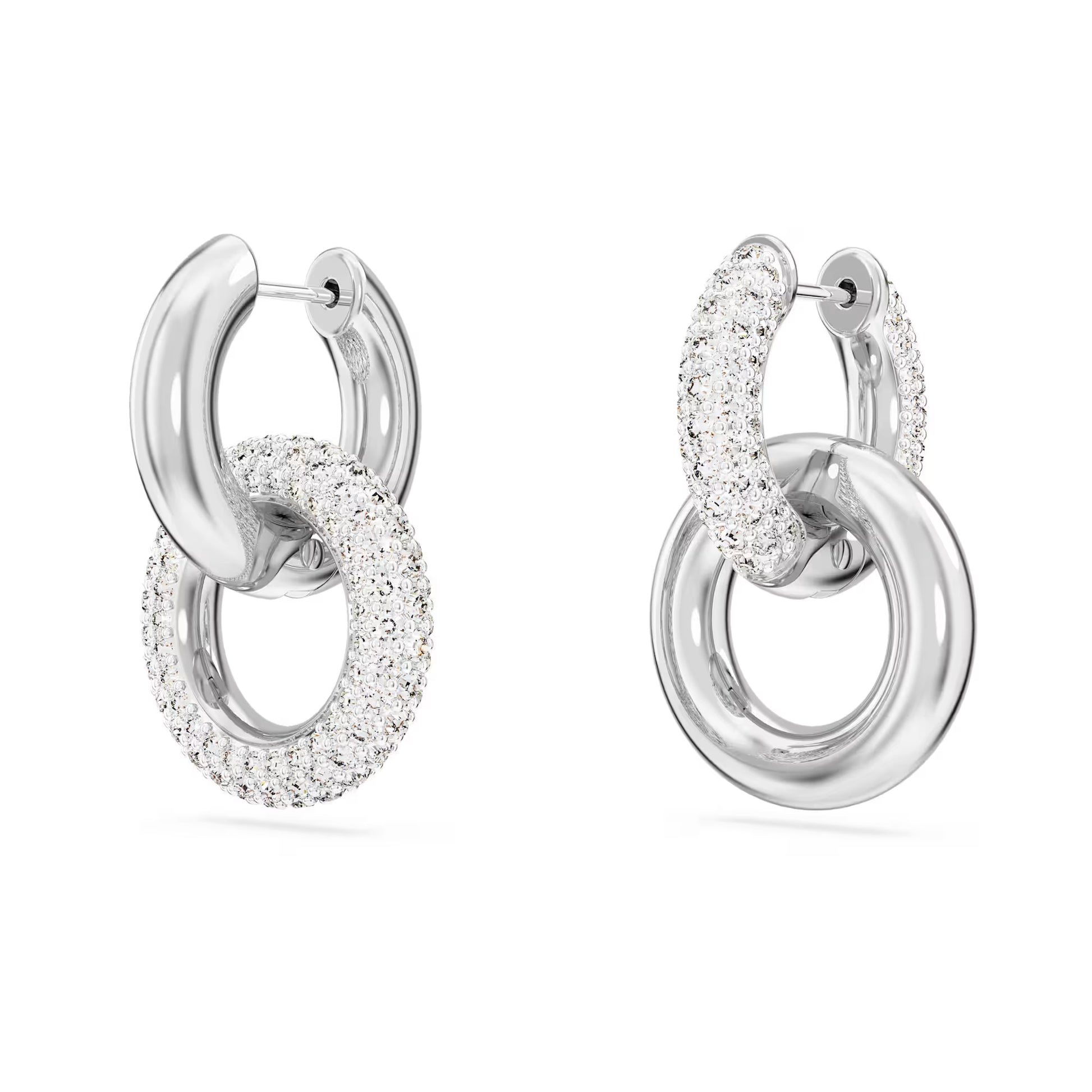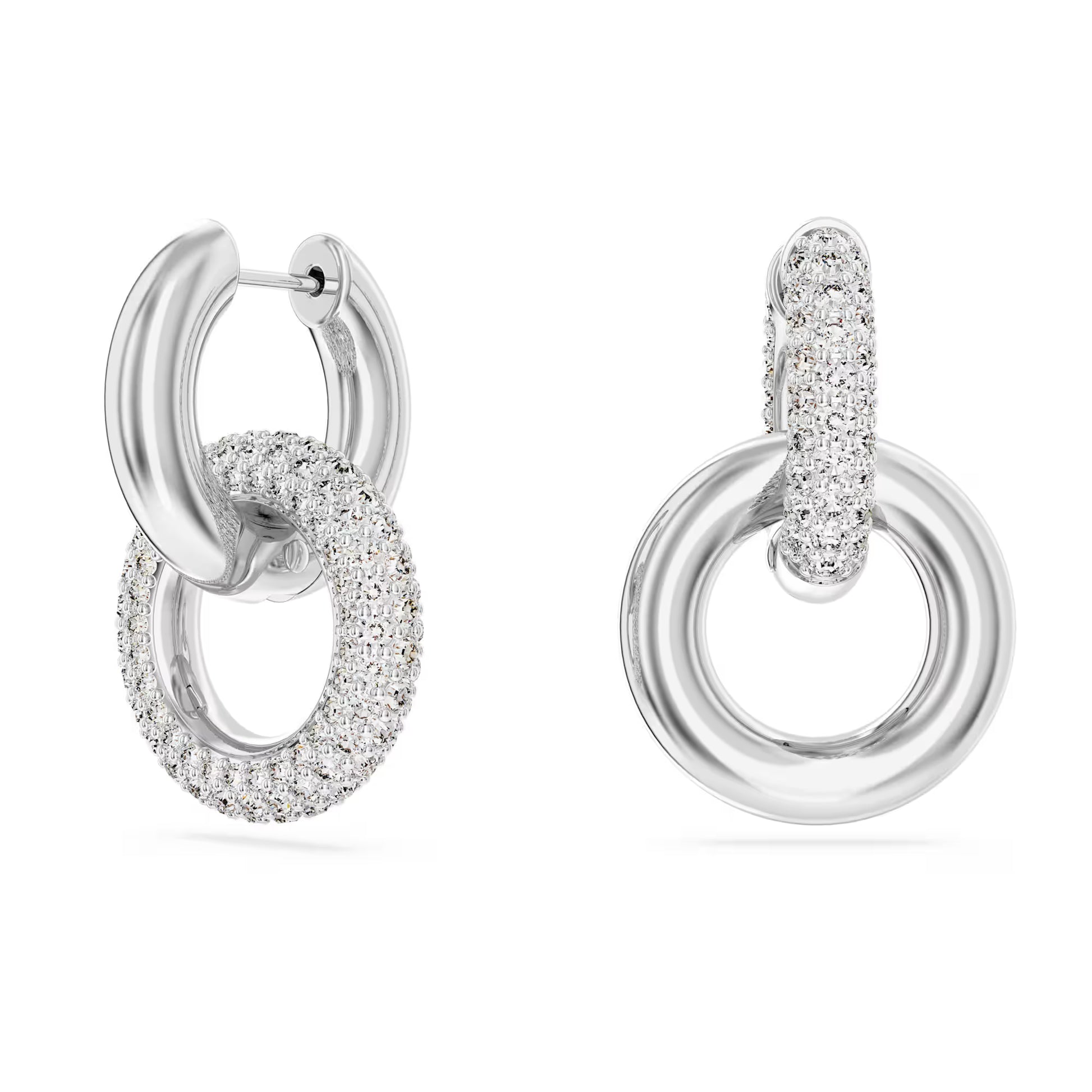 These Dextera interlinked hoops feature two rhodium plated tubular rings, one with all-over pavé. To add an asymmetrical touch, the positioning of the rings is different on each piece, and for added versatility you can detach the second hoop for a single hoop style.
