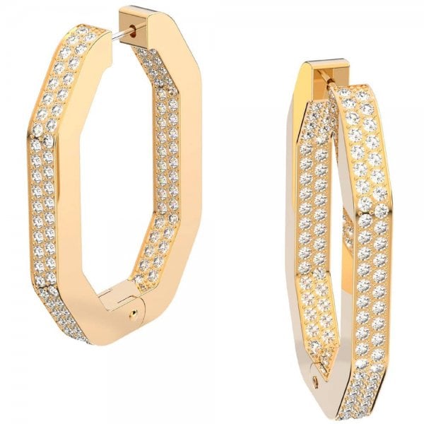 Celebrating Swarovski's sophisticated pavé technique, these intricately detailed yet boldly constructed, large, octagonal, hoop earrings make a modern statement. Delicate, white crystals embedded in gold-tone, plated settings highlight an industrial-inspired design that you can wear alone, or styled on the ear with other pieces from the Dextera family.