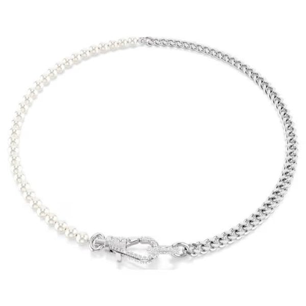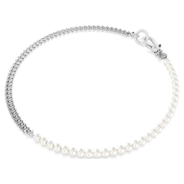 This rhodium plated necklace strikes the perfect balance between industrial chic and modern elegance. Its bold design combines a classic Dextera chain with a string of white Swarovski Crystal Pearls, united in the centre with a distinctive lobster closure encrusted with a pavé of clear crystals. A powerfully elegant everyday piece.