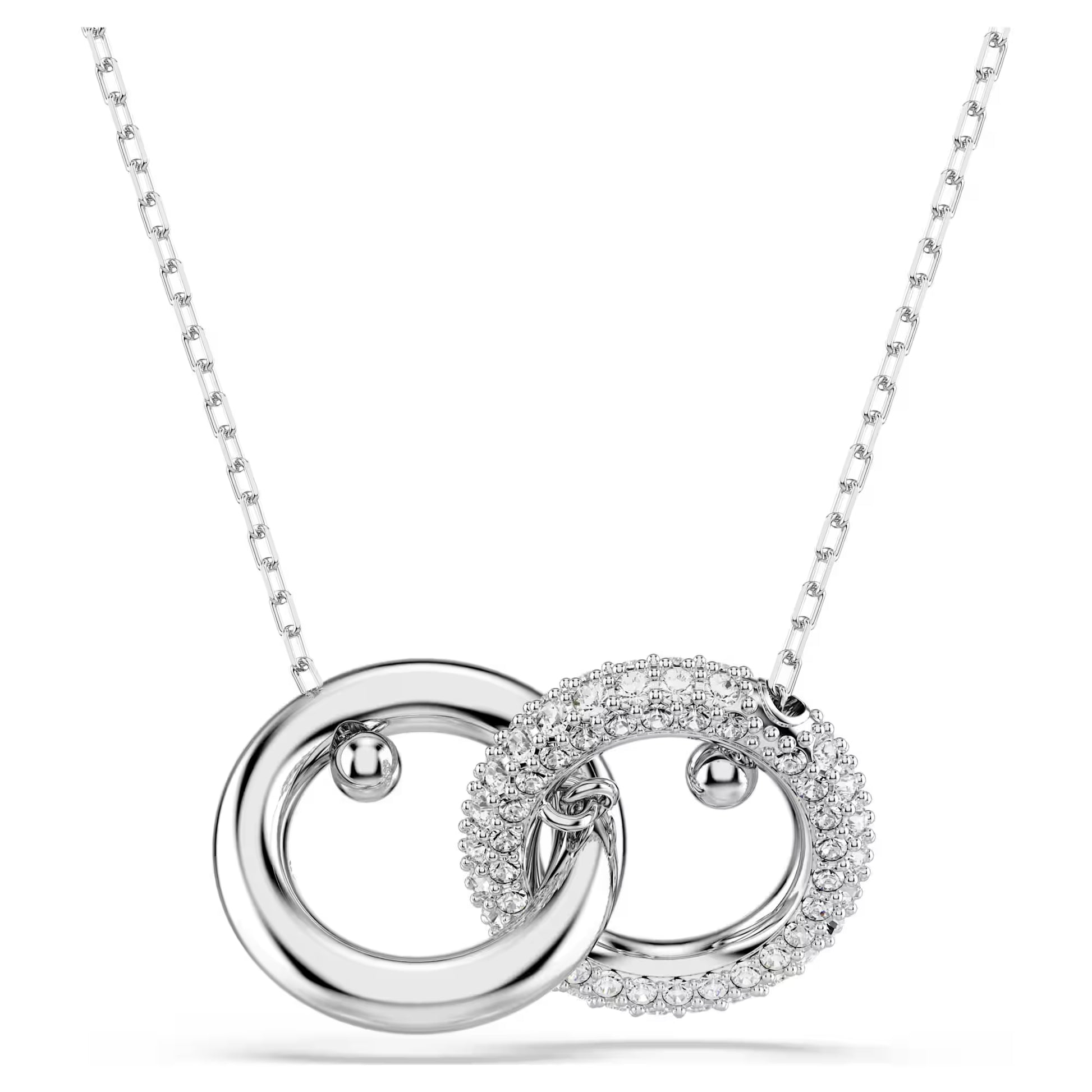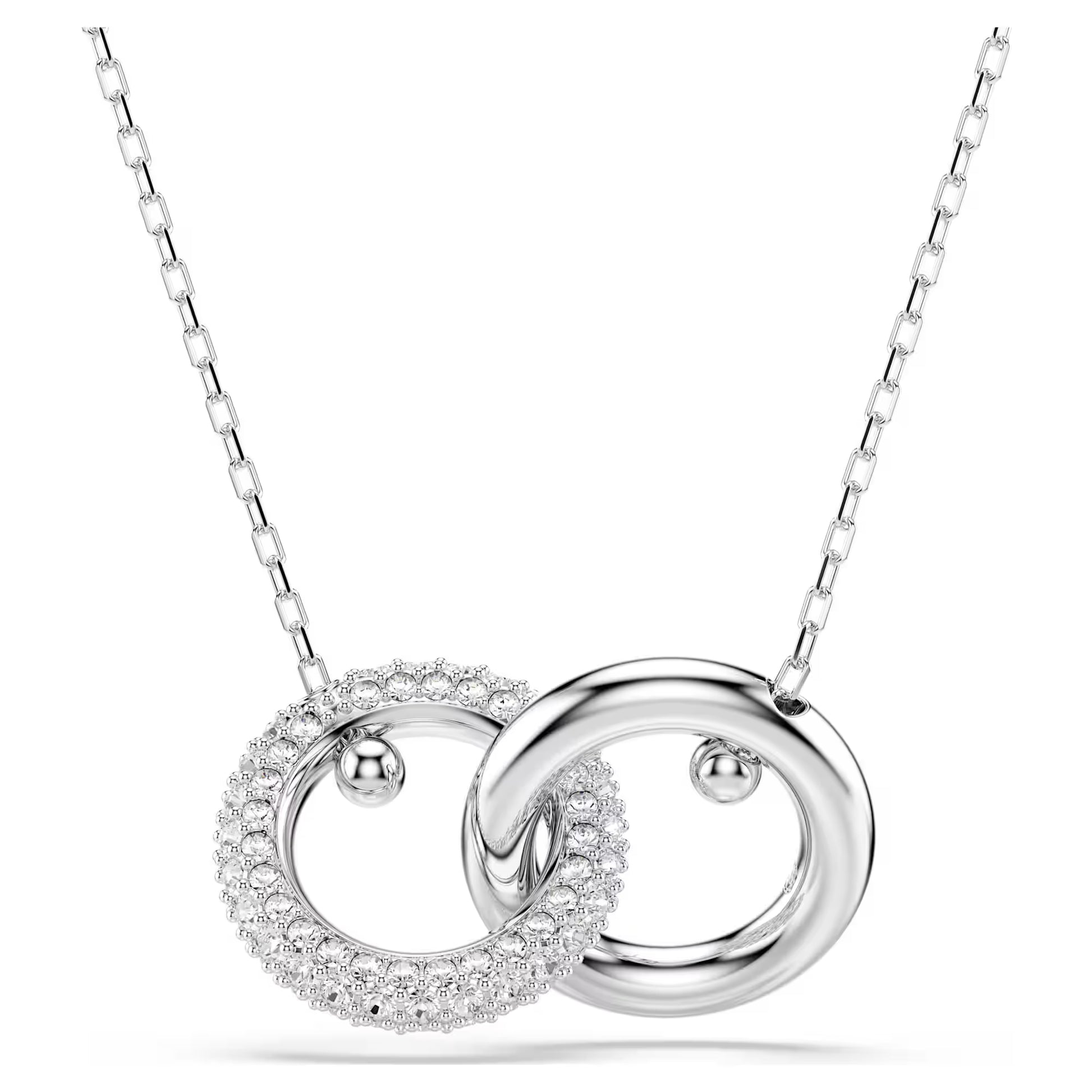 Embrace the spirit of unity with this pendant from the Dextera family. The rhodium plated features two interlinked tubular rings, one shimmering with all-over pavé. The delicate chain includes a single Swarovski Zirconia adorning the end for added luxury. Combining bold shapes with radiant clear crystals, this spellbinding piece will maximize your style.