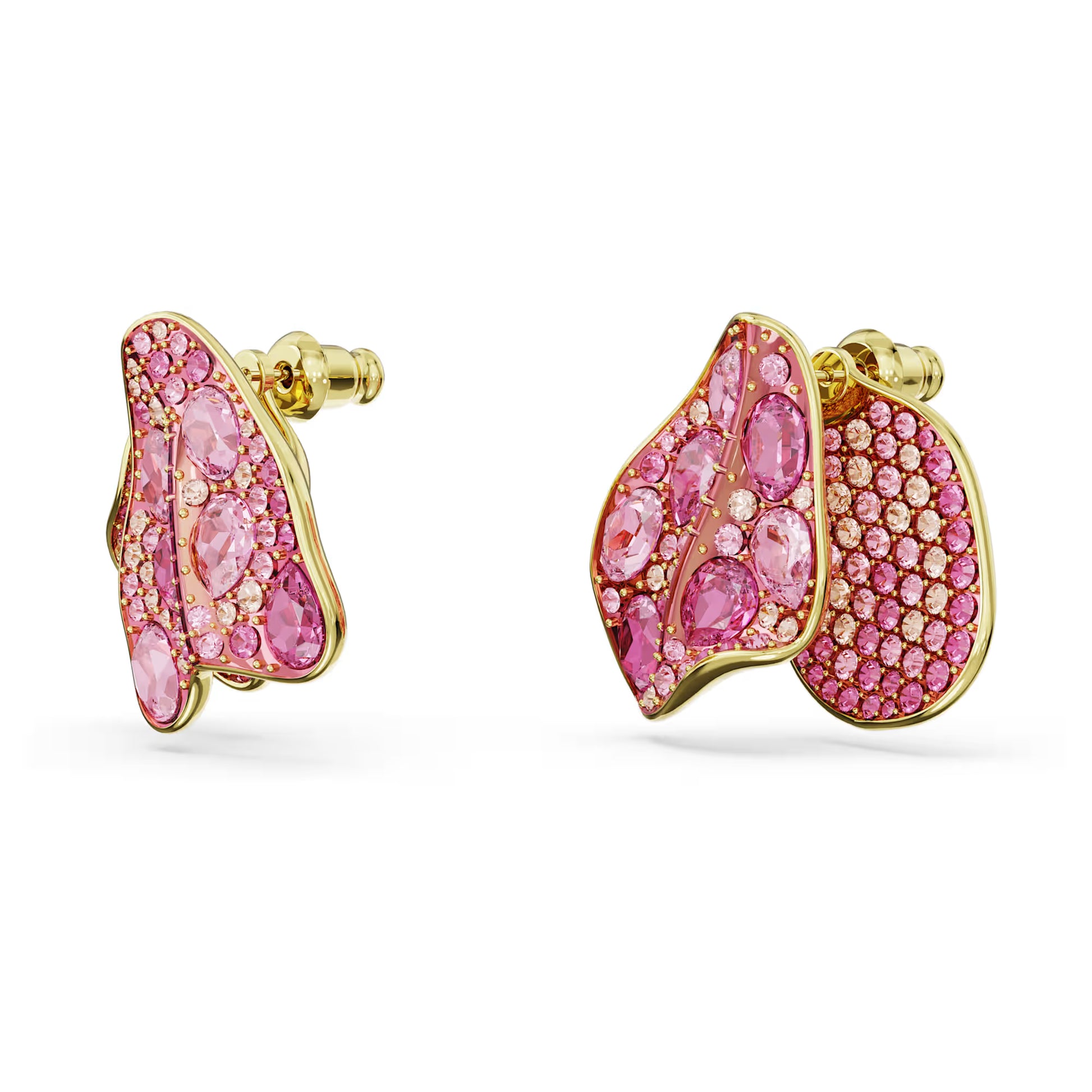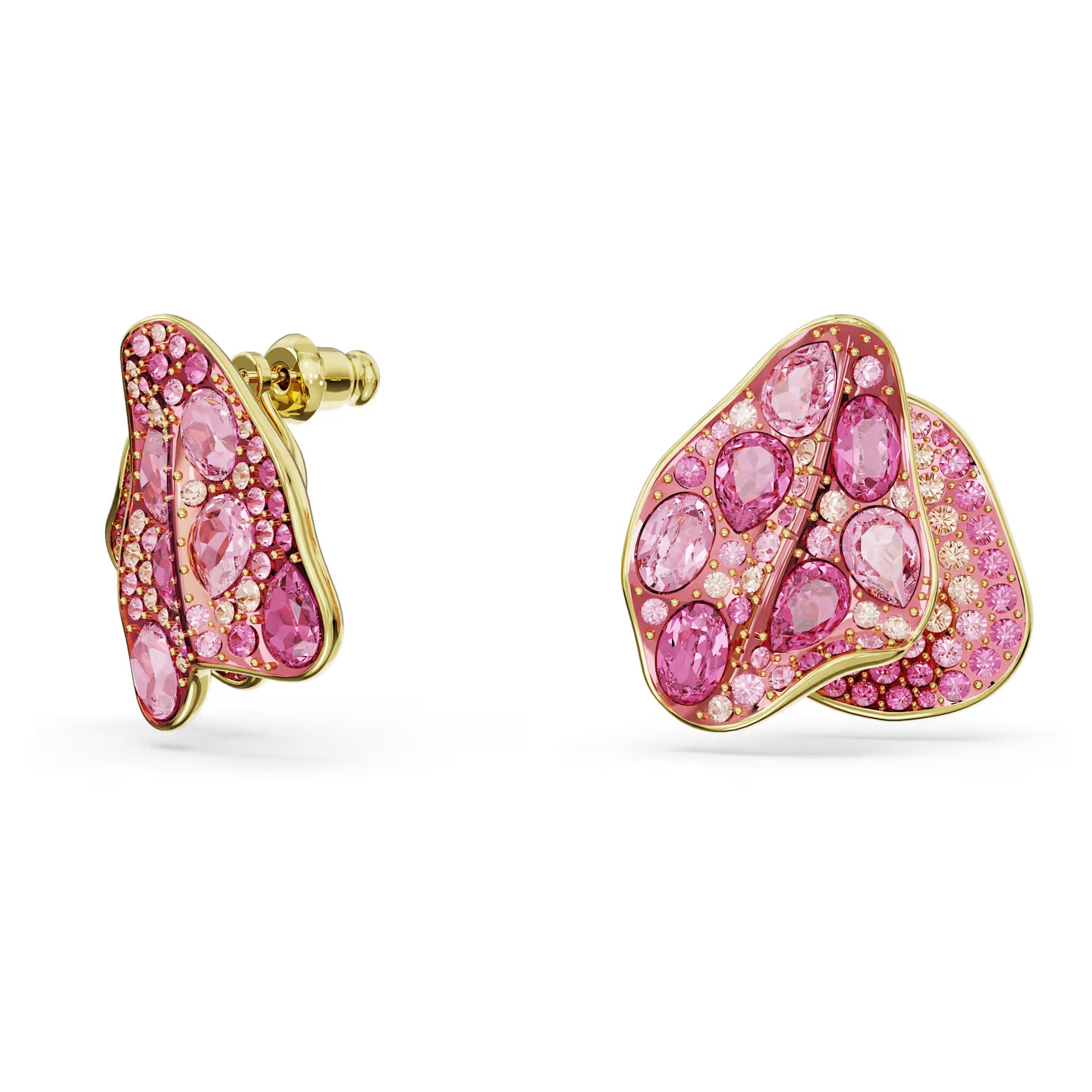 Draw attention to your style with these vibrant asymmetrical stud earrings. Designed with a delicate petal motif, each gold-tone plated piece is crafted with an array of pink crystals and celebrates Swarovski's unique savoir faire. Wear them for a touch of luxury, or gift them to a loved one.