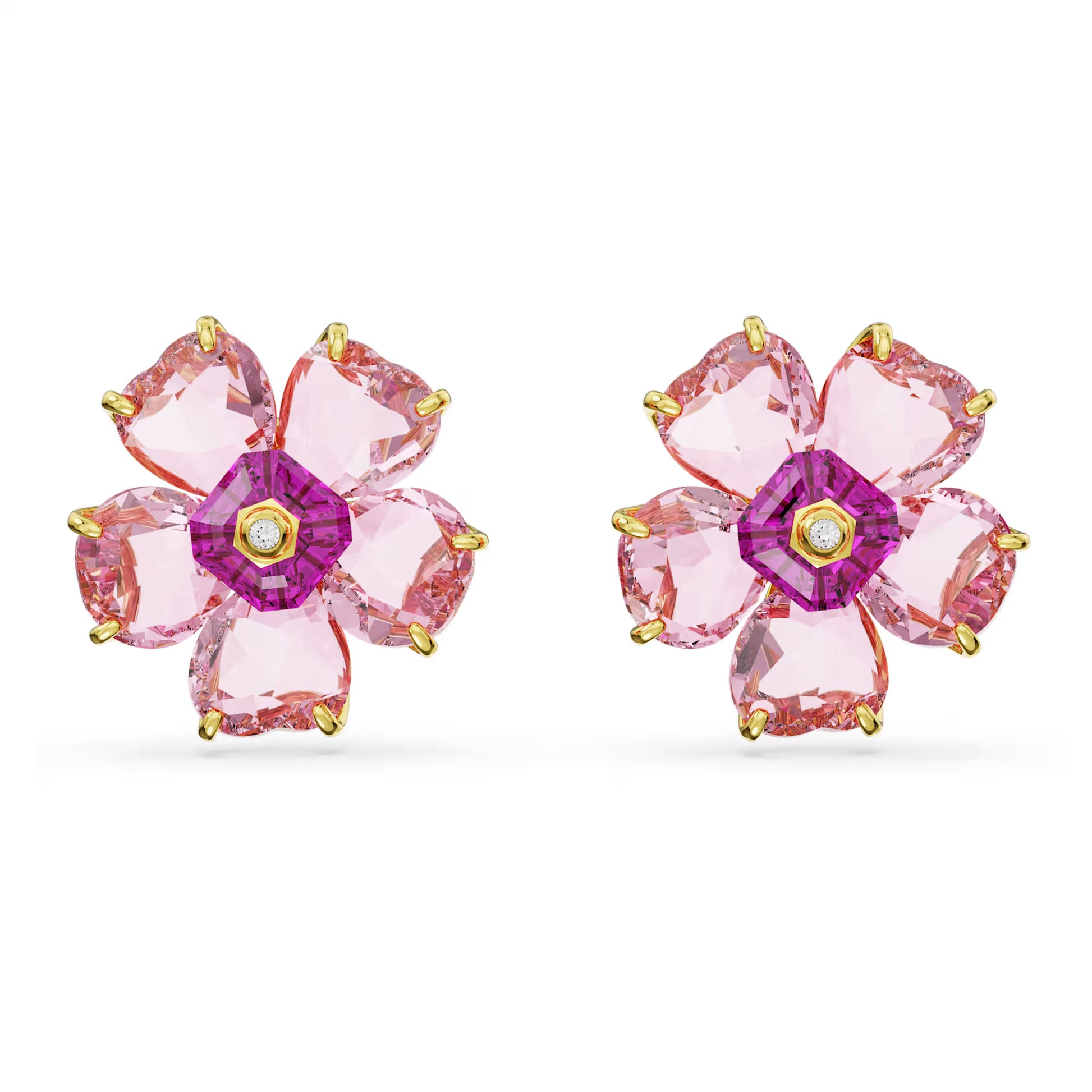Inspired by the wondrous beauty of florals, these pierced earrings are waiting to be picked. Set on gold-tone plating, the alluring design is made from an array of pink crystals arranged as petals around a stone in a deeper hue. A captivating design to harness the wonder of nature.