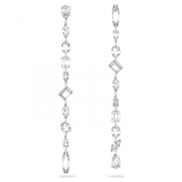 This striking pair of earrings falls to shoulder-grazing length with a string of oval, pear, emerald, and navette-cut crystals finished with a rhodium-plated setting. Style yours with other designs from the Gema family for a dramatic light-catching look.