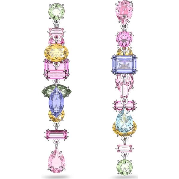 These multicoloured drop earrings feature a mix of oval, pear, emerald and navette-cut crystals, arranged in a random formation. An elegant yet playful twist on the essence of Swarovski crystals, wear yours with an off-the-shoulder top to highlight their pastel hues and kinetic craftsmanship, or pair with the matching necklace from the Gema family. These earrings are part of the Gema family, designed by Creative Director Giovanna Engelbert for Collection III.