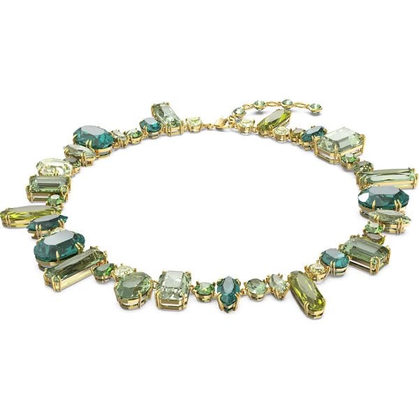 Celebrating the magic of crystals through an array of mixed, classic cuts, this necklace is assembled in an unexpected formation. Finished with a gold-tone plated setting, highlighting rich shades of green, this necklace makes a prismatic statement, however you might choose to wear it. This necklace is part of the Gema family, designed by Creative Director Giovanna Engelbert for Collection III.