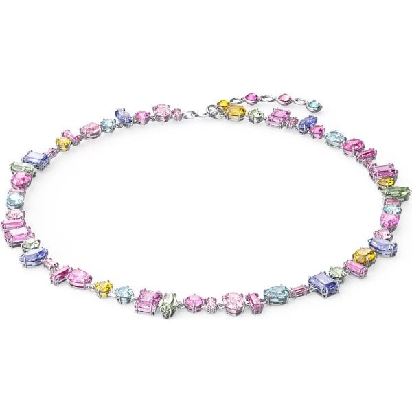 This necklace is expertly formed from a dazzling array of crystals in mixed, classic cuts, assembled in an unexpected formation. Finished with a silver-tone plated setting, highlighting pastel tones, this necklace makes a joyful and mood-boosting statement, however you might choose to wear it. This necklace is part of the Gema family, designed by Creative Director Giovanna Engelbert for Collection III.