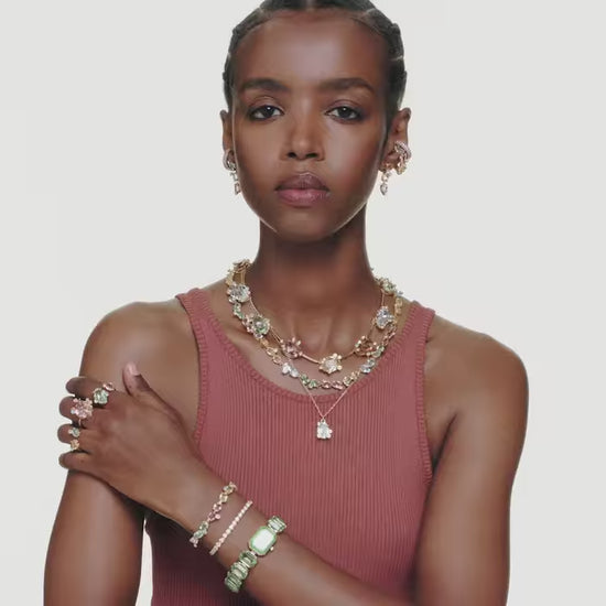 This effervescent Gema pendant will fill your everyday style with colour. Suspended from a delicate gold-tone plated chain, the central motif features a large green crystal, surrounded by smaller crystals in a joyful bubble prong setting. The expert faceting and various hues ensure this pendant catches the eye at all times. Pair it with a matching bracelet to maximise the energy-boosting effect.