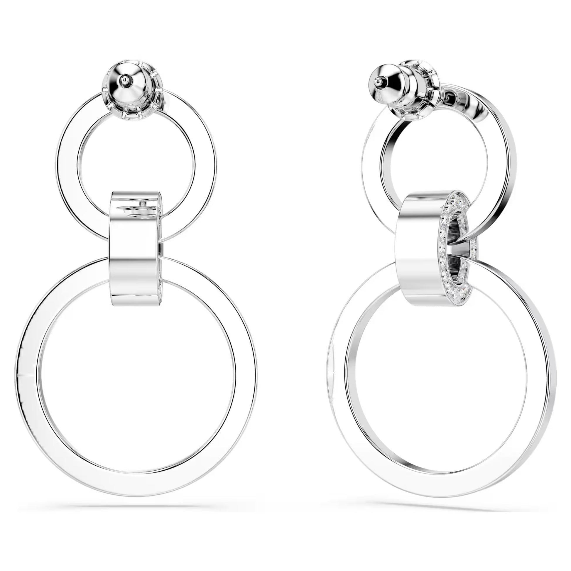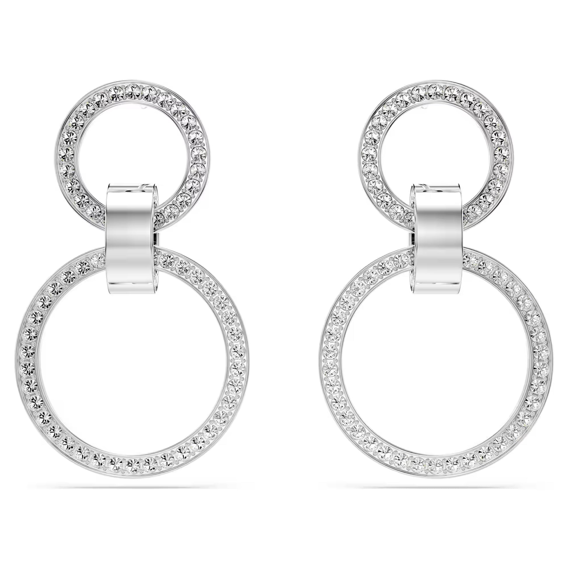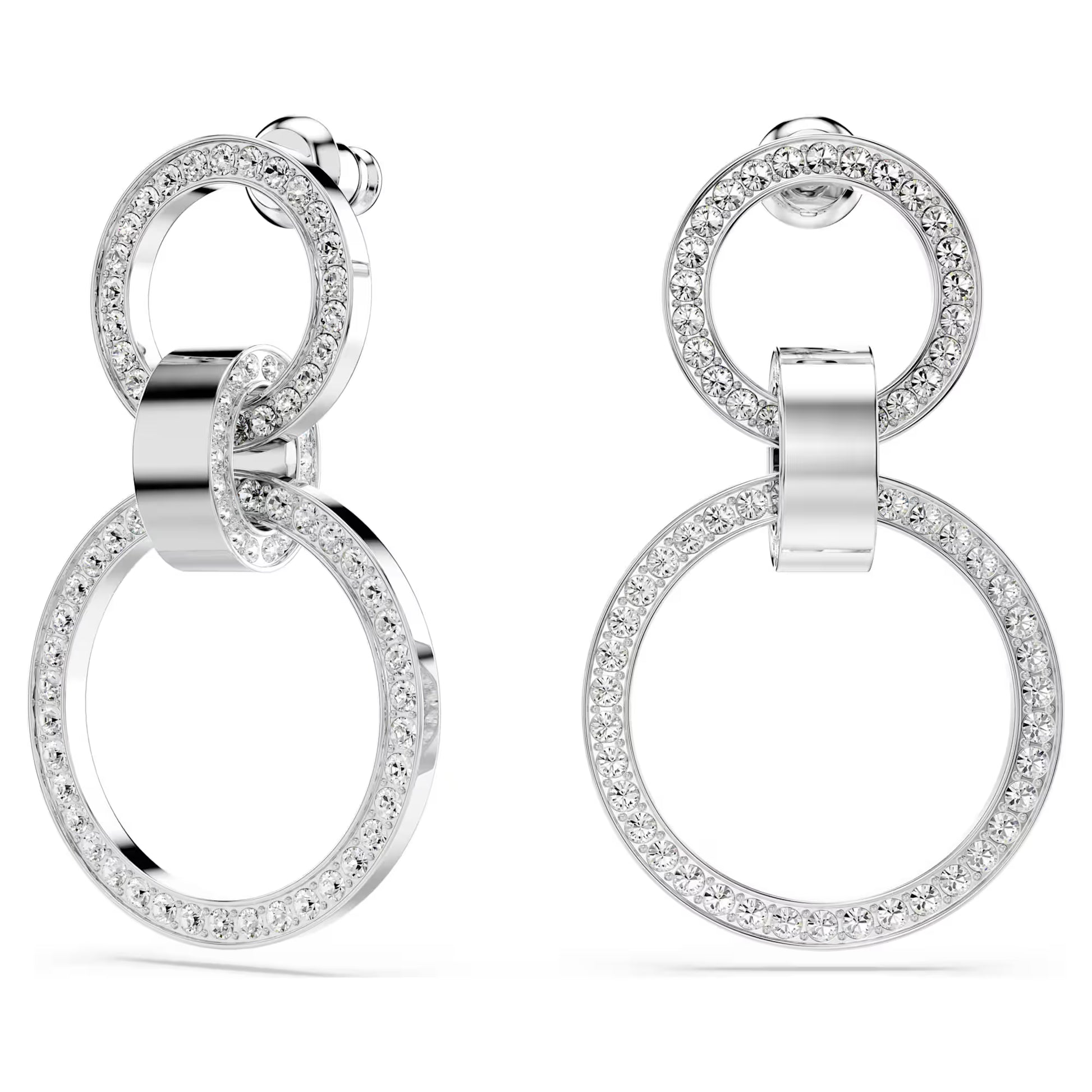Bold and empowering, these chandelier earrings will turn heads. Interlocking rhodium plated circles are adorned with shimmering crystal pavé in a feat of meticulous craftsmanship that will elevate any look.
