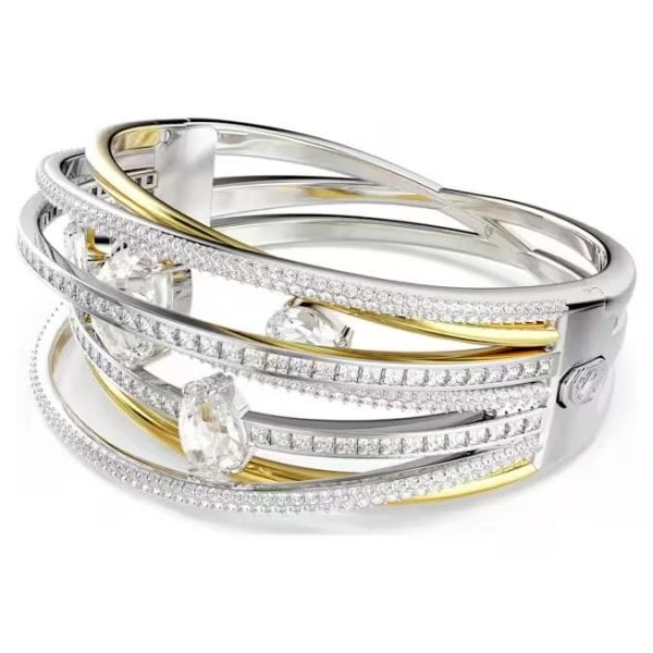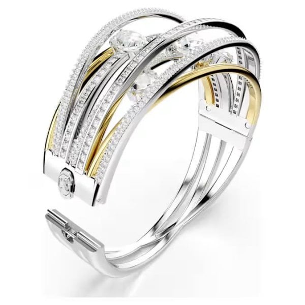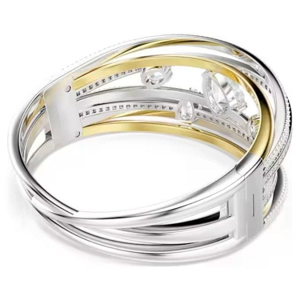 This twisting Hyperbola bangle reveals the best of Swarovski savoir-faire. The hypnotic design is made from multiple bands in rhodium and gold-tone plating, with clear Swarovski Zirconia added in channel and prong settings. Clear crystals are also placed in between for extra impact. Style this intricate jewellery with a matching necklace to empower your look with elegance.