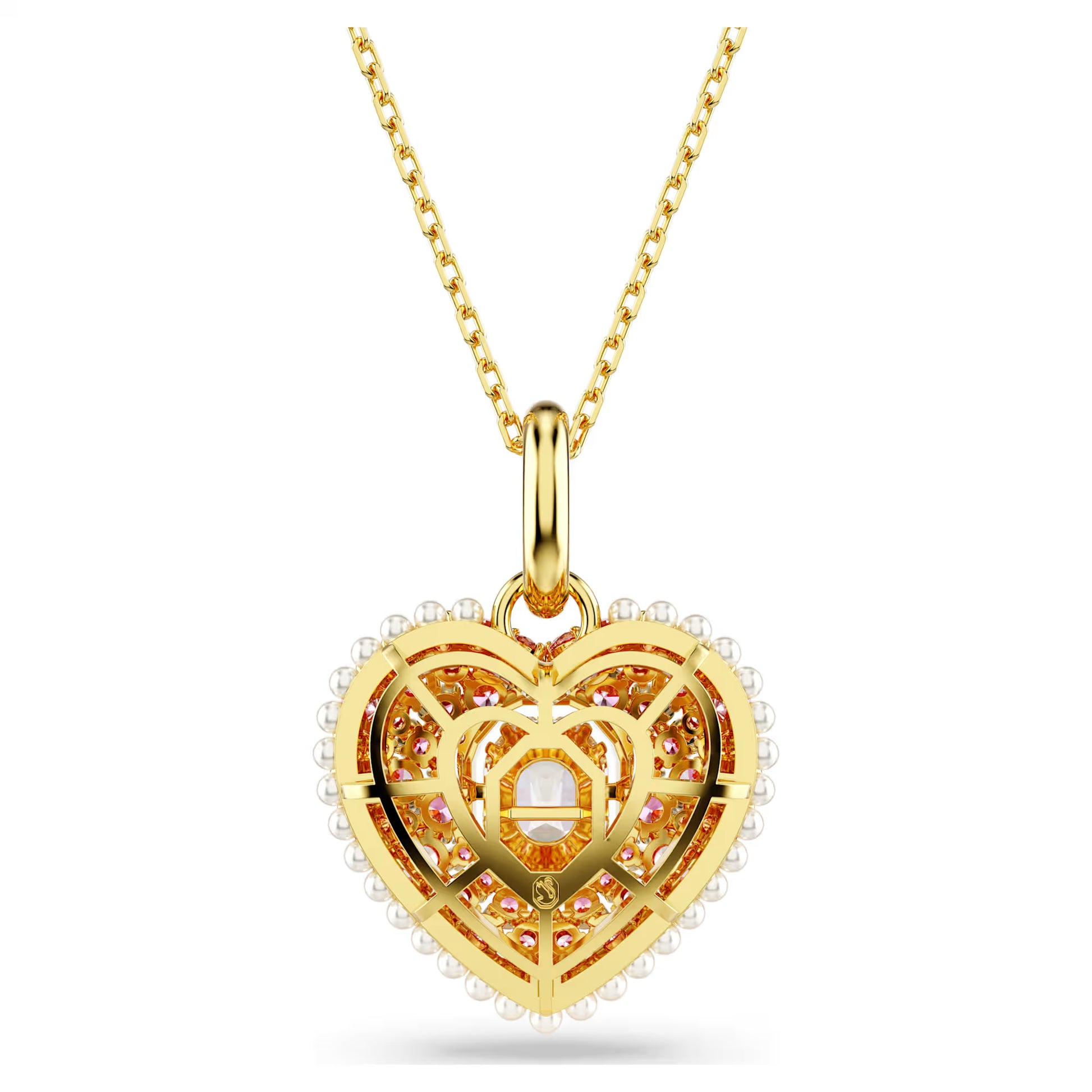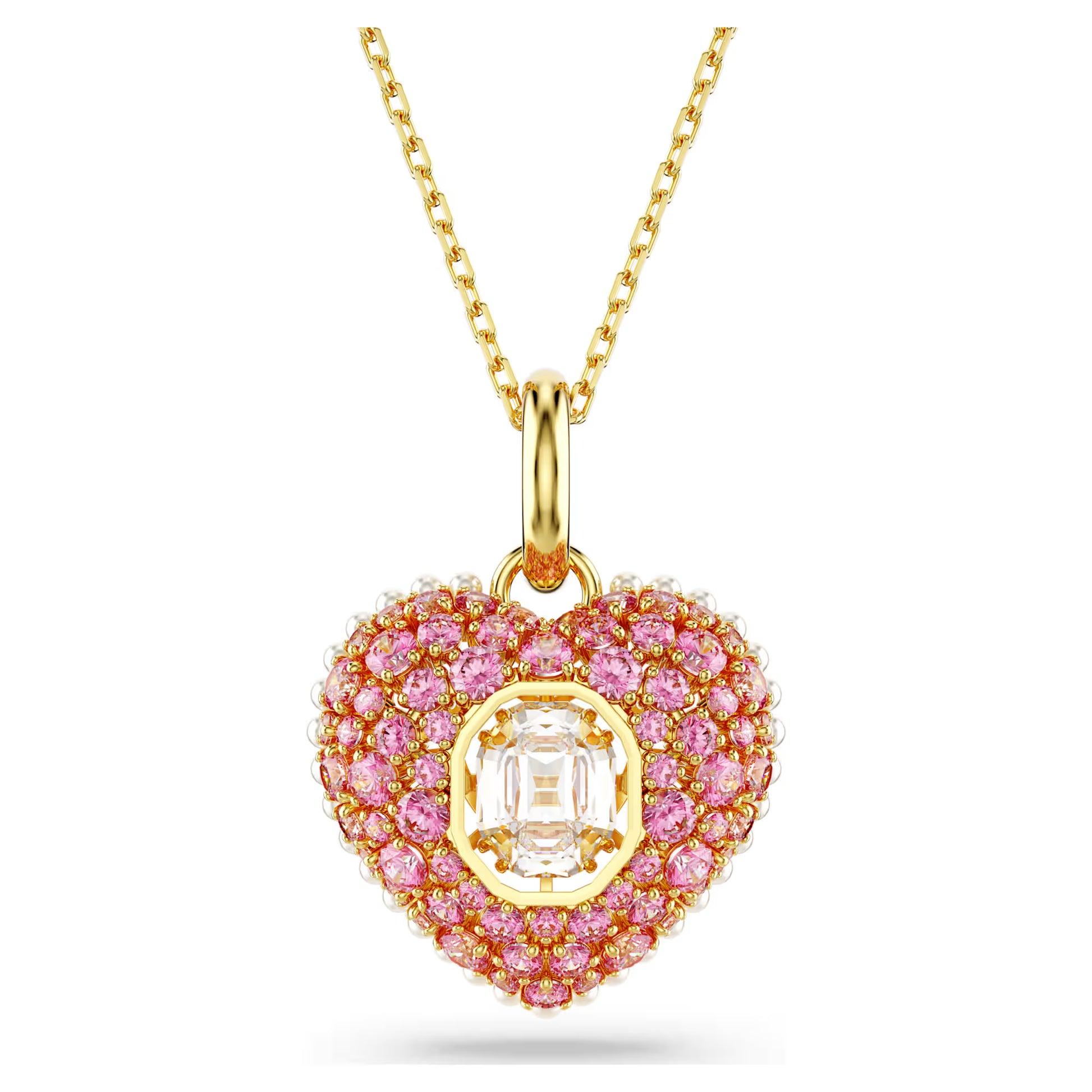 Let your heart be captured by this striking Swarovski pendant. The gold-tone plated motif has been created with a cage design for maximum volume and features an array of tiny white Crystal Pearls around the edging. To enhance the domed effect, it is adorned with round pink Swarovski Zirconia, set in place using the dazzling chatonnage technique, while at the center, an octagonal dancing stone catches the light from every angle. Gift this as a special surprise to someone you adore.