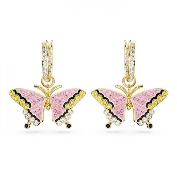 These beautiful earrings from the Idyllia family capture a radiant butterfly in flight. Set in gold-tone plating, the delicate wings are formed from crystals in pink, white, black, and yellow, and hang from a crystallized mini hoop. Add a magical flutter of colour to a white T-shirt, denim, or an evening look - anything goes.