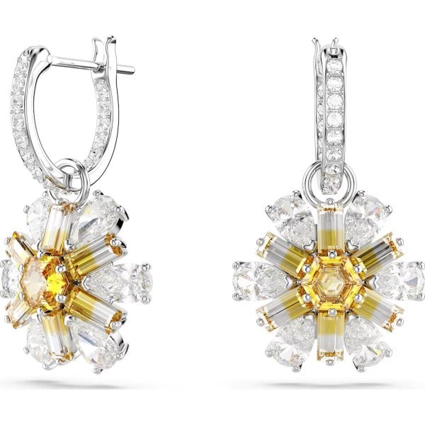 These bright and delicate pierced earrings are filled with color and character. Each rhodium-plated piece is attached to a mini hoop adorned with clear crystals, and features a vibrant flower, precisely crafted from yellow and clear Swarovski Zirconia, with a striking gradient effect for added modernity. A perfect display of Swarovski savoir-faire that will inject your style with nature-inspired beauty.