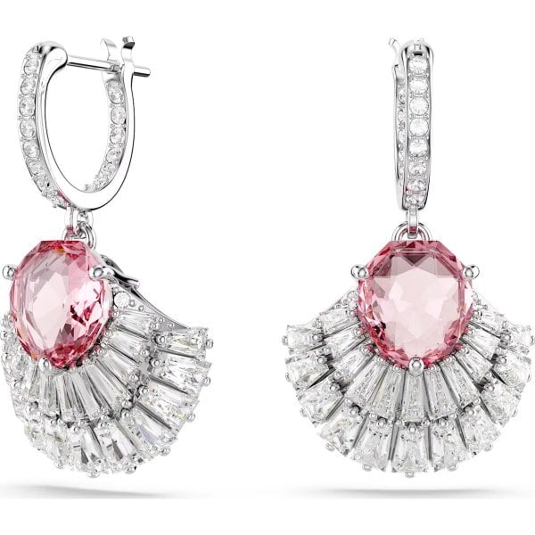 Dip into the calming spirit of the ocean with these graceful Hyperbola earrings. Connected to mini hoops adorned with clear crystals, each shell design is rhodium plated and embellished with an array of clear Swarovski Zirconia, as well as a bright pink central crystal. Wear this nature-inspired jewelry every day to let your style shine.