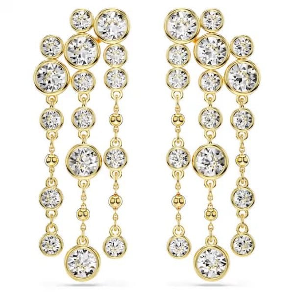 Dramatic and dazzling, these wondrous pierced earrings were designed to make a statement. Each gold-tone plated piece features a hanging design of metal droplets and round-cut crystals in a puffy bezel setting. With such a captivating array of sizes and facets on display, this pair is a perfect way to infuse your look with radiance.