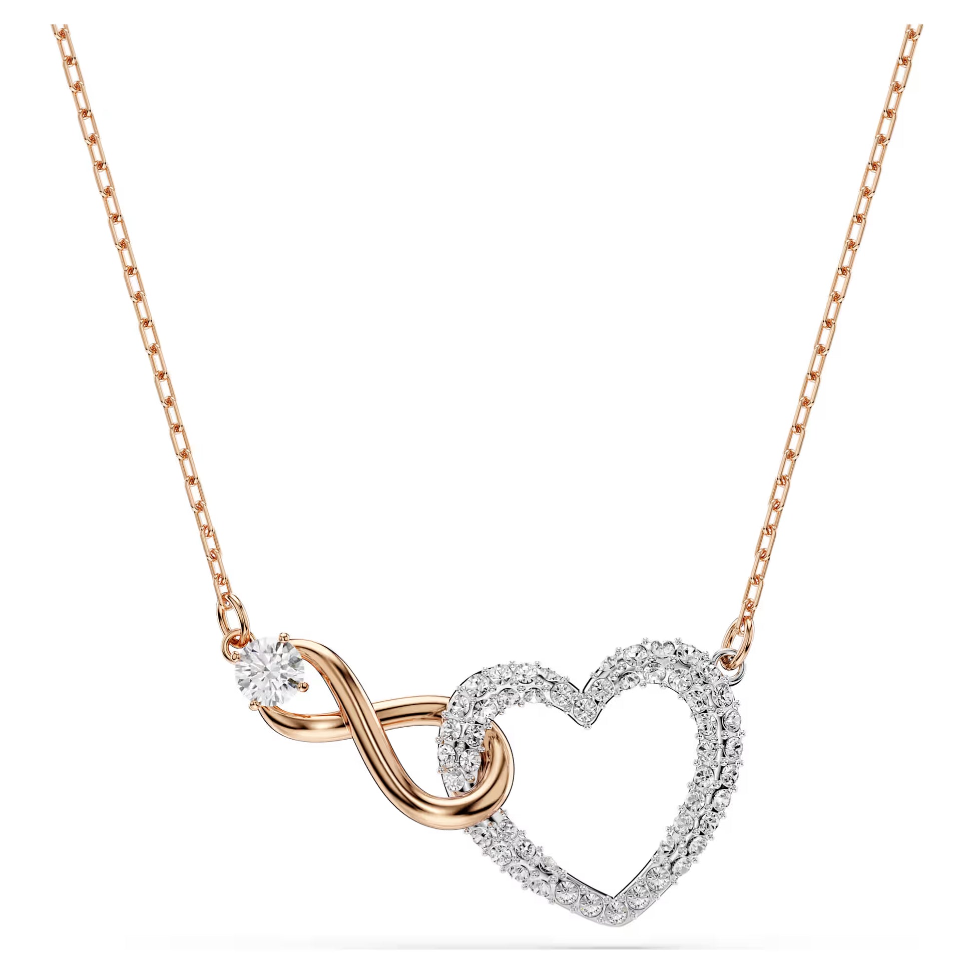 Eternal romance: The symbols of love and infinity are bound together in this elegant Swarovski necklace. A white crystal heart is intertwined with a rose-gold tone plated infinity symbol in this lovely piece, which is a visible representation of the promise of everlasting love. A perfect gift for your significant other.