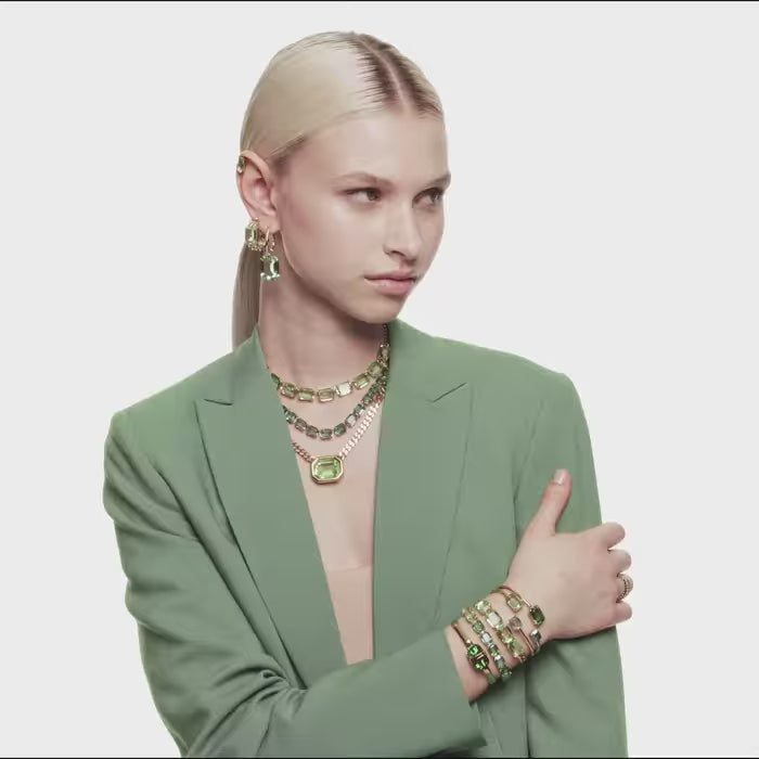 Dress up a simple outfit with this elegant, octagon-shaped bangle. Designed with a full crystal cut in vibrant green, this geometric-inspired piece features a gold-tone PVD coated setting and an innovative magnetic closure. Wear yours with everything from denim to tailoring. This bangle is part of the Lucent Family, designed for Collection III. How to close and open it: to close, place one magnet on top of the other and slot together. To open, locate the small indent on the side of the magnetic closure, slide your fingernail in and pop it open.