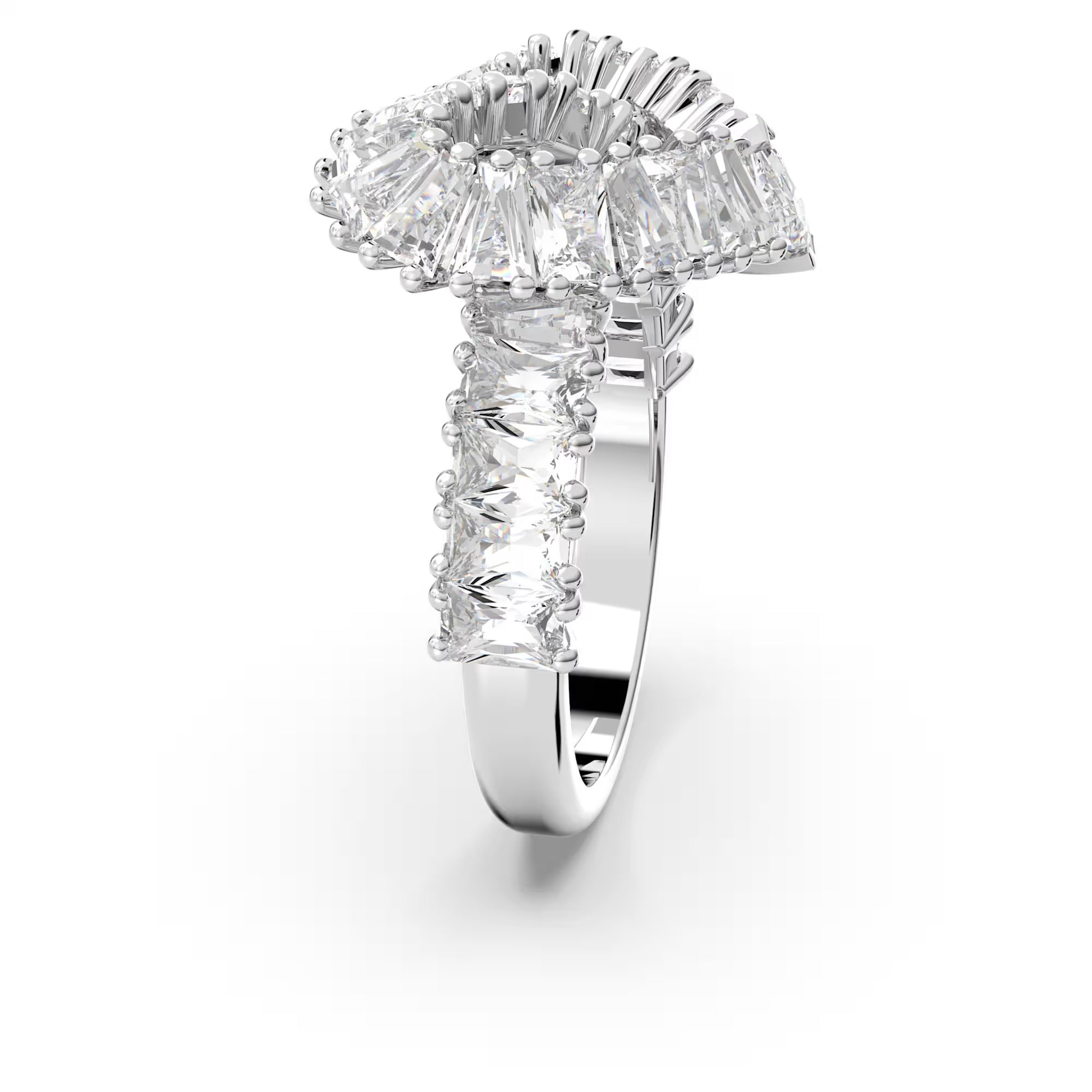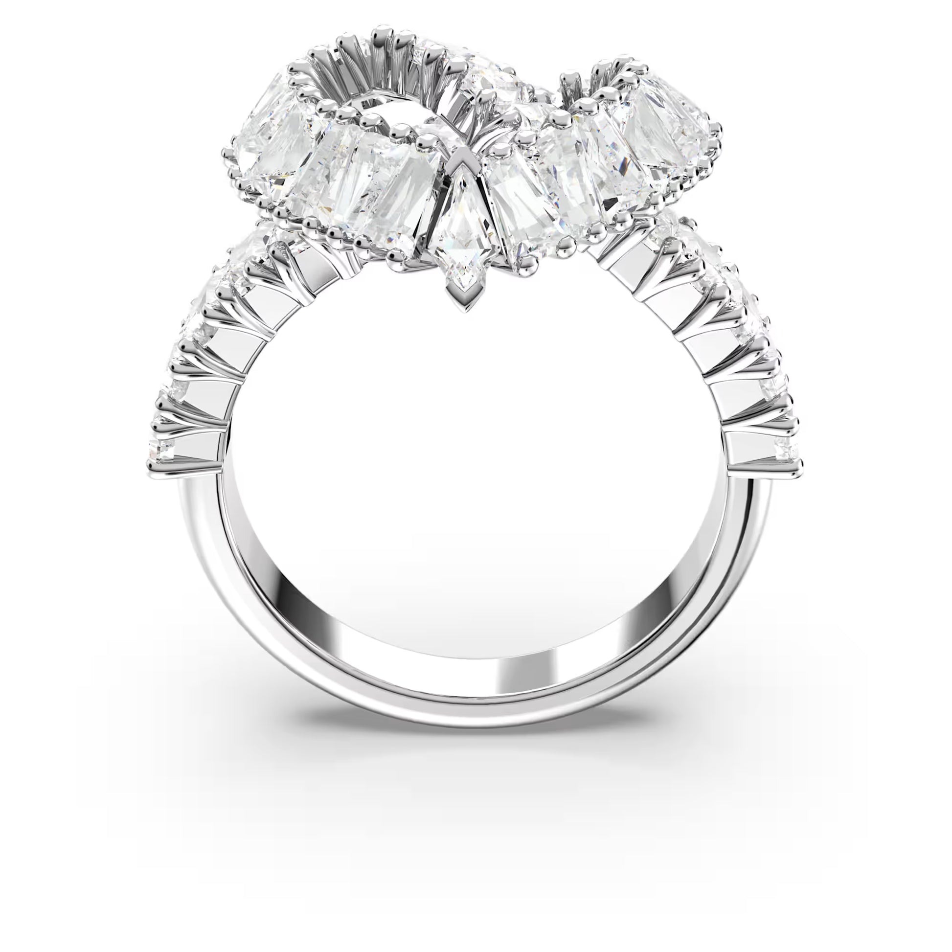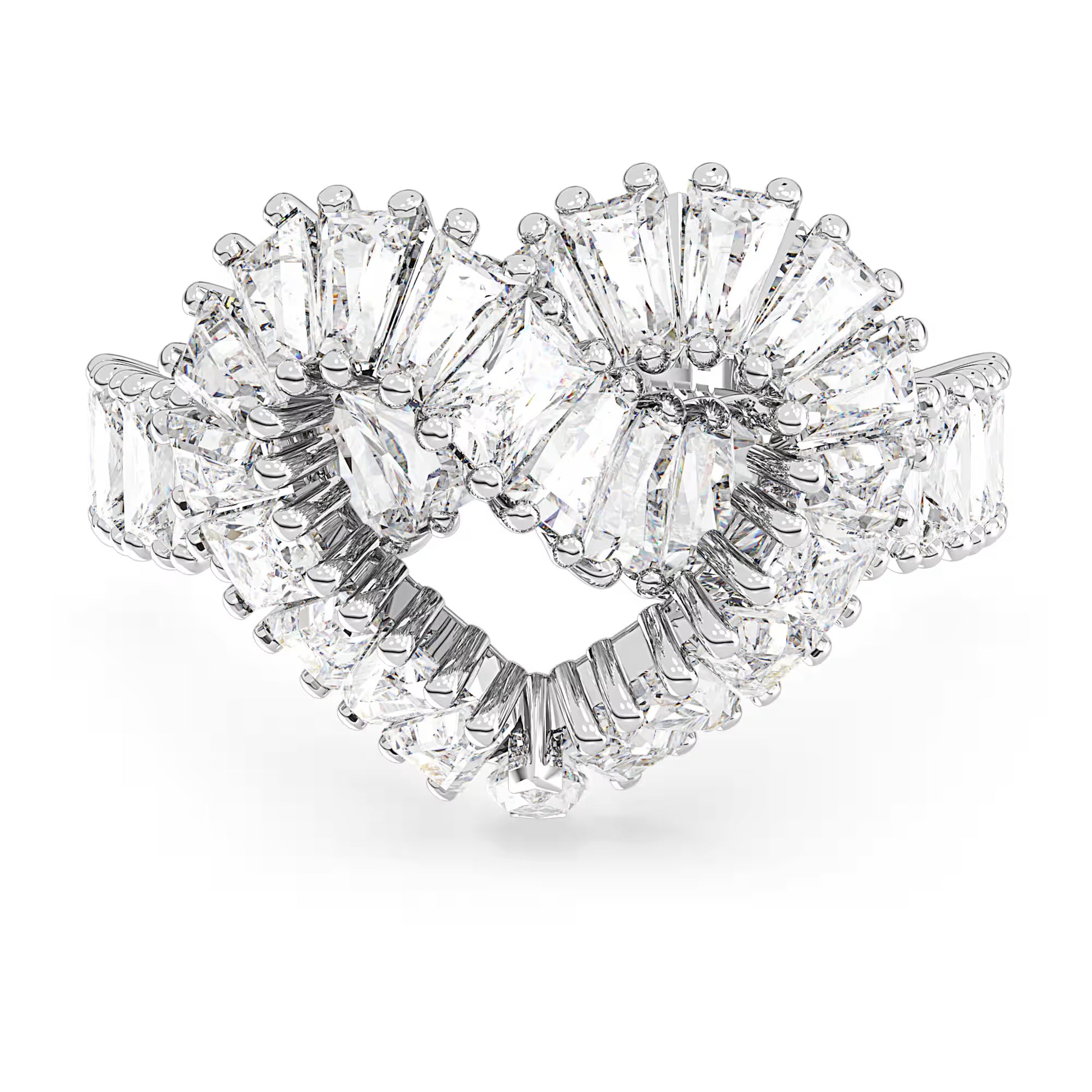 Woven into an exceptional heart-shaped style, this Matrix ring is positively shining with elegance. The craftsmanship begins with a rhodium plated design, which has been embellished with an array of clear stones in various cuts, including baguette, tapered baguette, and kite. The result is quite sensational. Choose this piece to express your own passion for beauty, or as the perfect gift for a loved one.