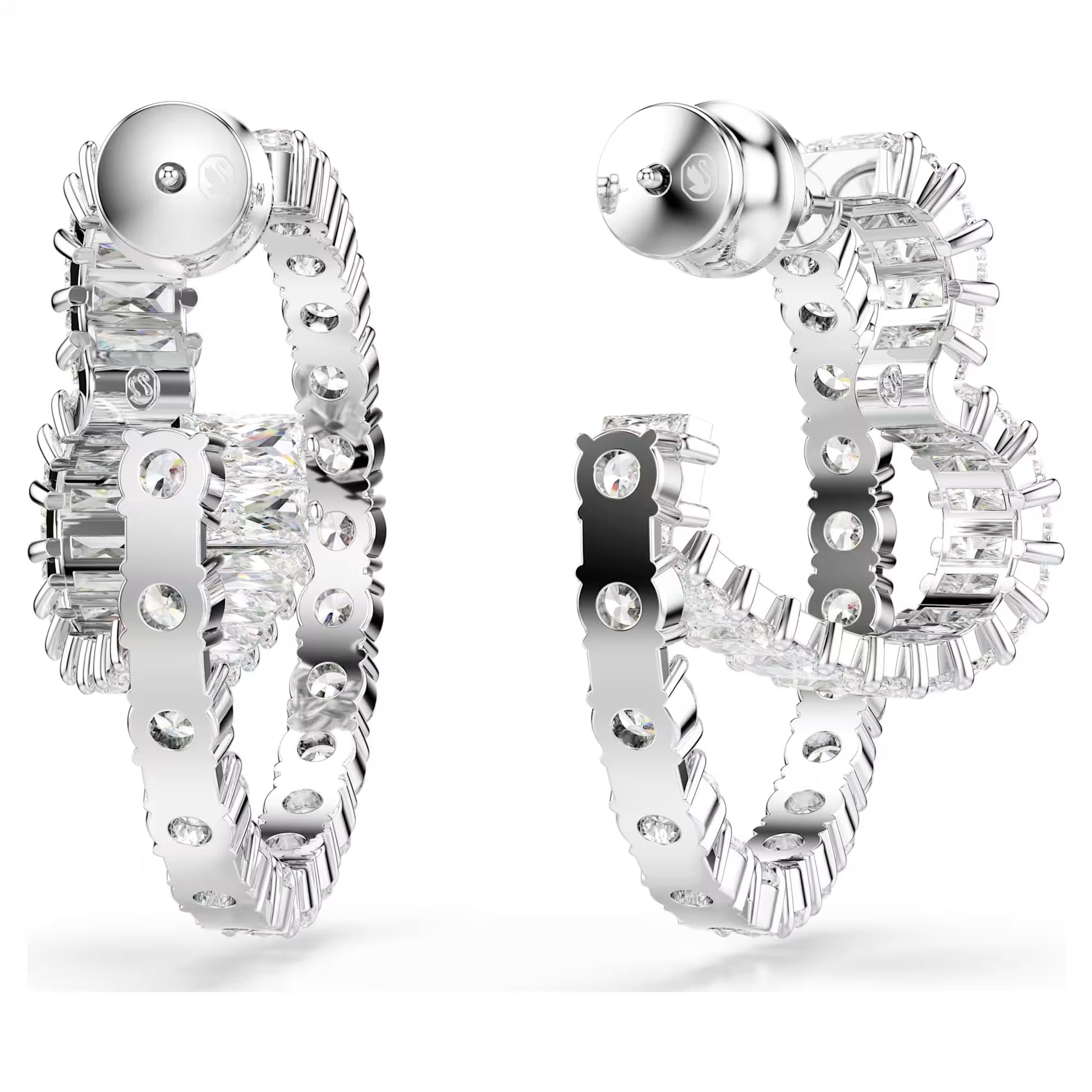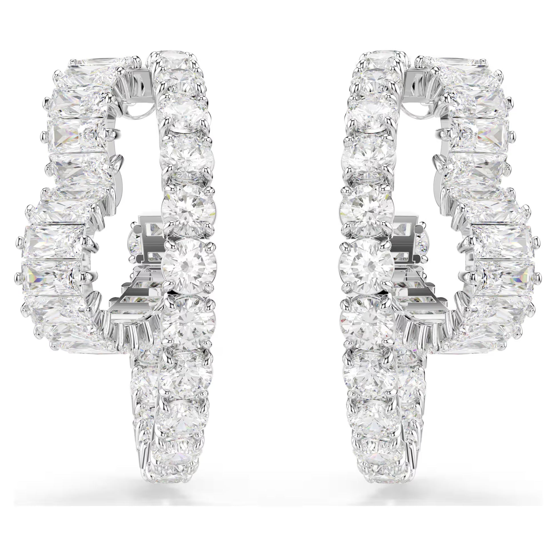 Infused with the symbol of love, these pierced Matrix earrings are radiant and romantic. Each rhodium plated hoop features an open heart-shape in the middle, with a full adornment of baguette-cut Swarovski Zirconia in a clear hue. An exquisite choice for self-expression that will fill your style with light.