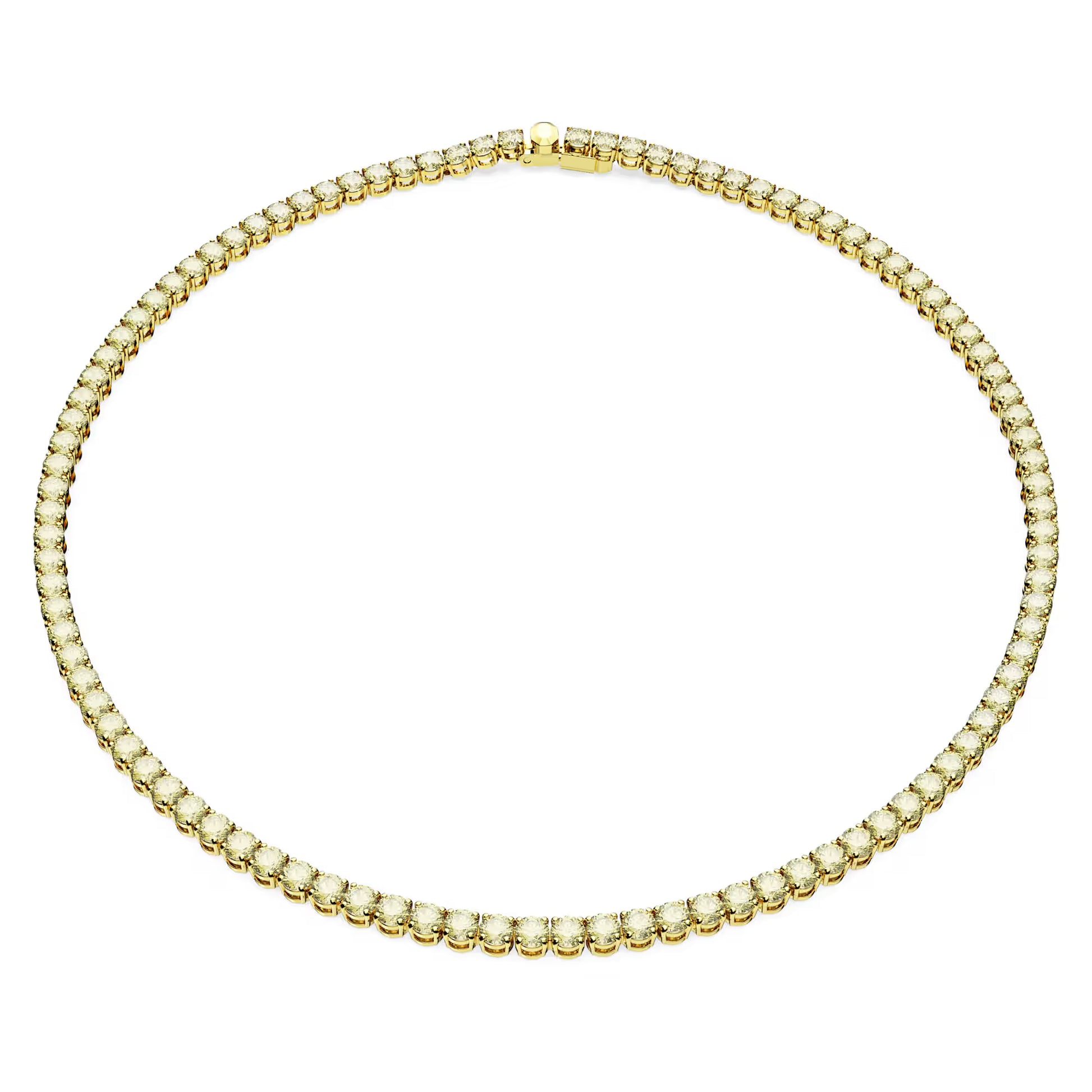 Swarovski Matrix Tennis necklace, round cut in yellow color, gold-tone plated. Size is Medium. Minimum length: 41 cm Maximum length: 41 cm Width: 0.4 cm Shine bright with this radiant Matrix Tennis necklace. The row of brilliant yellow colored round stones seems almost endless. Each stone is set on a gold-tone plated chain featuring a secure and refined clasp. This jewel will be an essential accessory for your everyday look. The reference is 5661191.