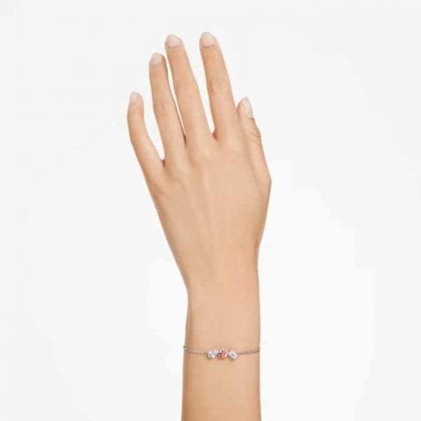 Accented with a vibrant flourish of colour, this Mesmera bracelet is ready to impress. The rhodium plated design is worn on a delicate chain with a hanging elongation and features a trio of prong-set Swarovski Zirconia in varying shapes, including a central round stone in blush pink. A bold mix of cuts that would make a wondrous gift.